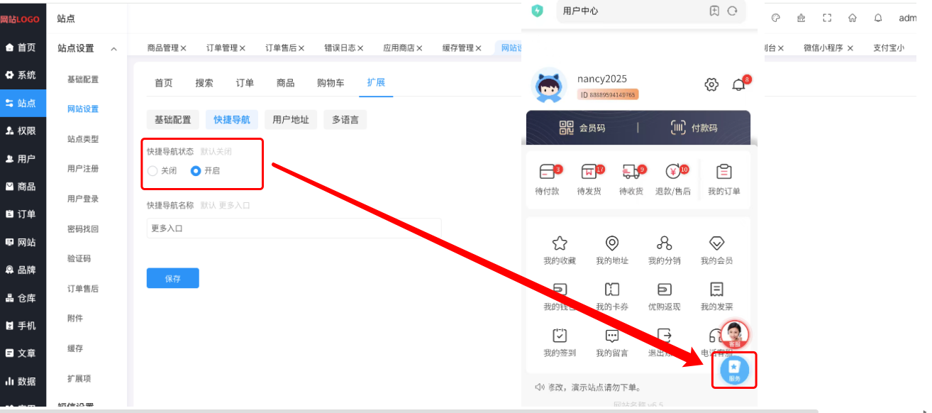 悬浮的“服务”快捷导航开关控制:【“站点”—–>“网站设置”—->“扩展”—–>“快捷导航”—->“快捷导航状态”】