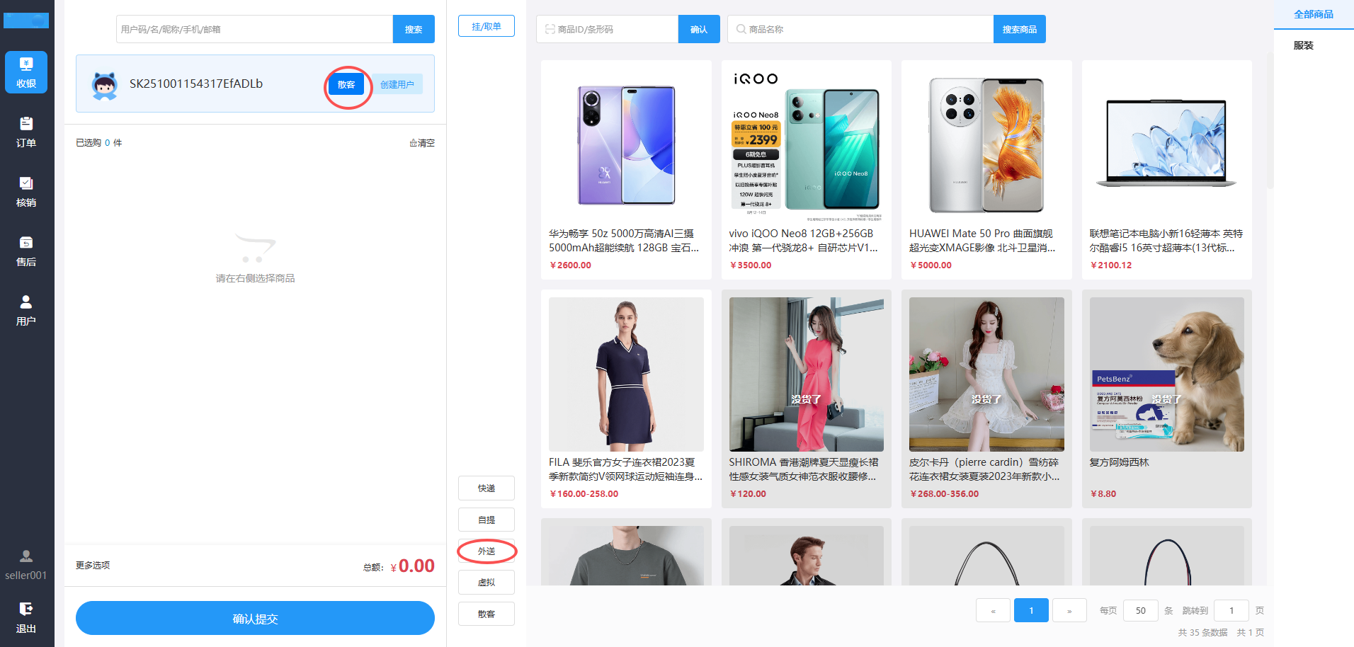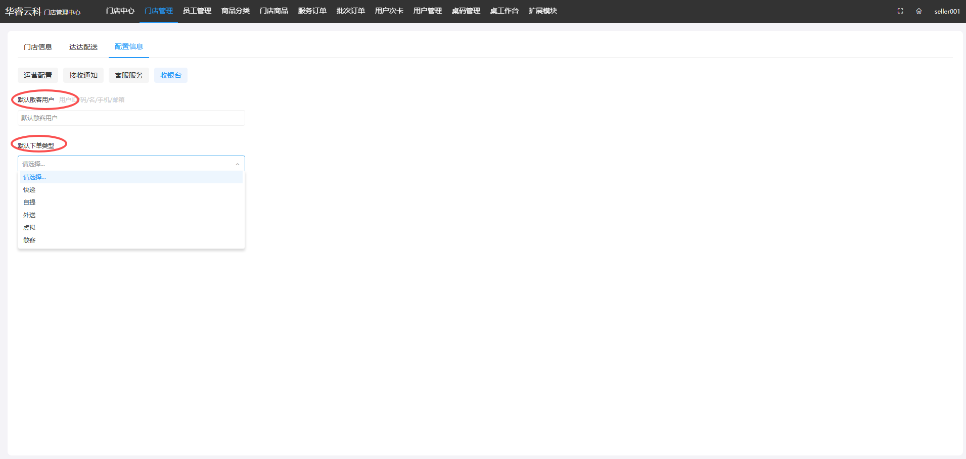 1.收银台配置页面中,输入默认散客用户名,在收银台页面左上用护栏显示相关名称信息。(用户名称只支持用户ID、码、手机号、邮箱)