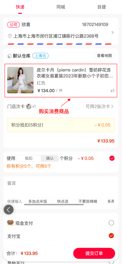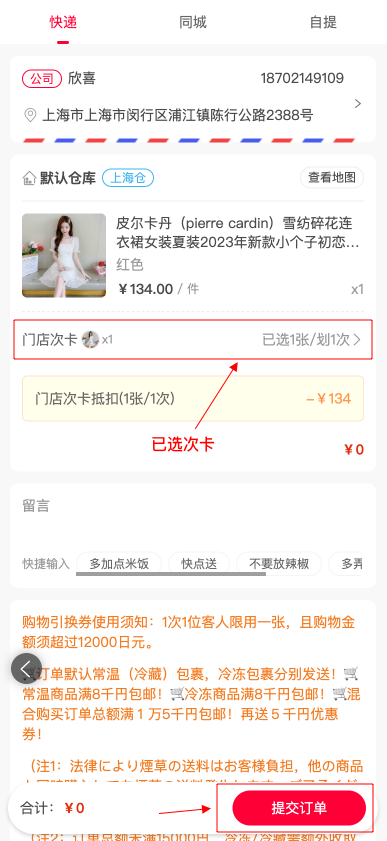 2.选择购买消费的商品,点击选择要抵扣的门店次卡,最后点击确认提交,完成次卡使用。