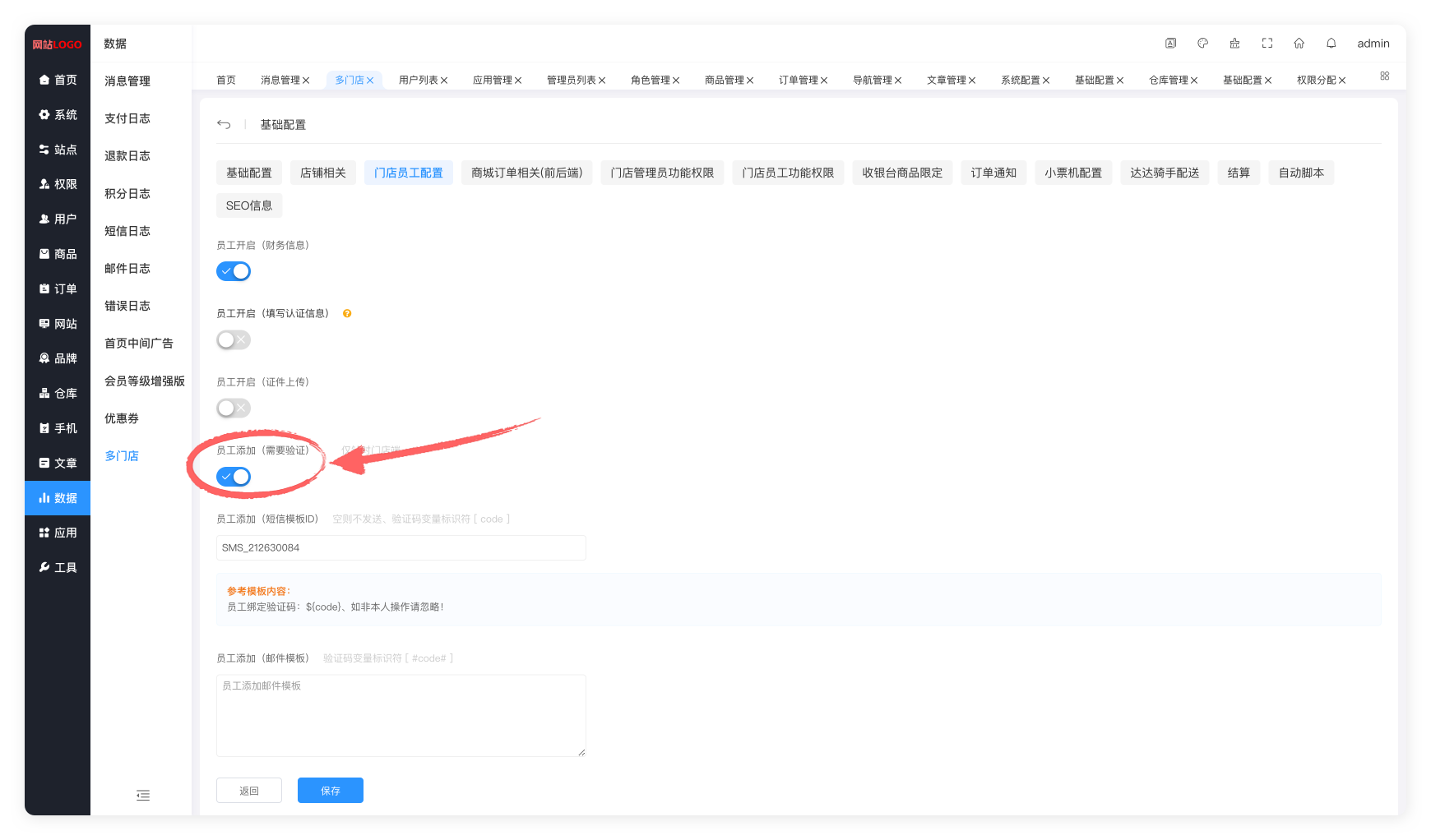 4.如何开启员工验证状态,在后台系统中:数据 → 多门店 → 基础配置 → 门店员工配置 → 员工添加(需要验证),打开开关按钮。