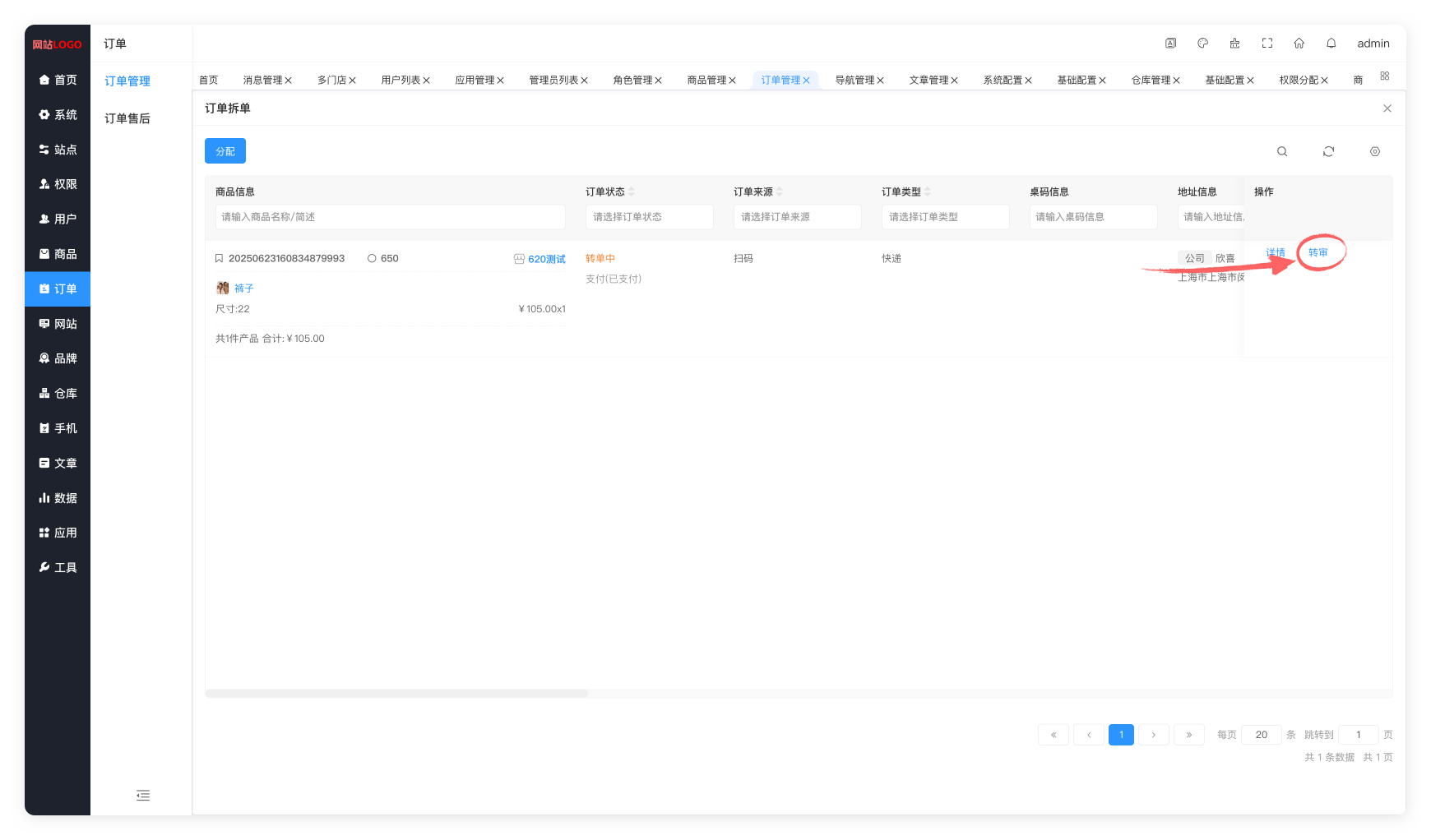 5.进入到订单拆单页面,点击转审按钮。