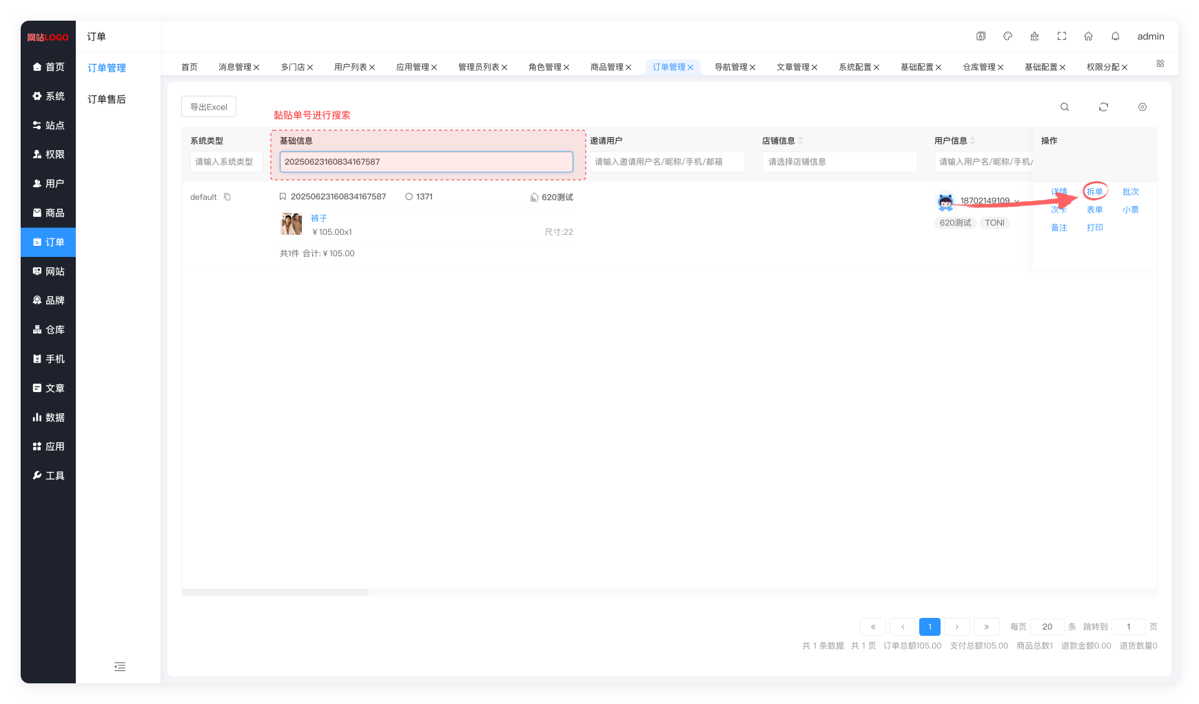 4.进入到后台订单管理页面,粘贴订单号到基础信息输入框中,搜索到相关订单,点击拆单按钮。