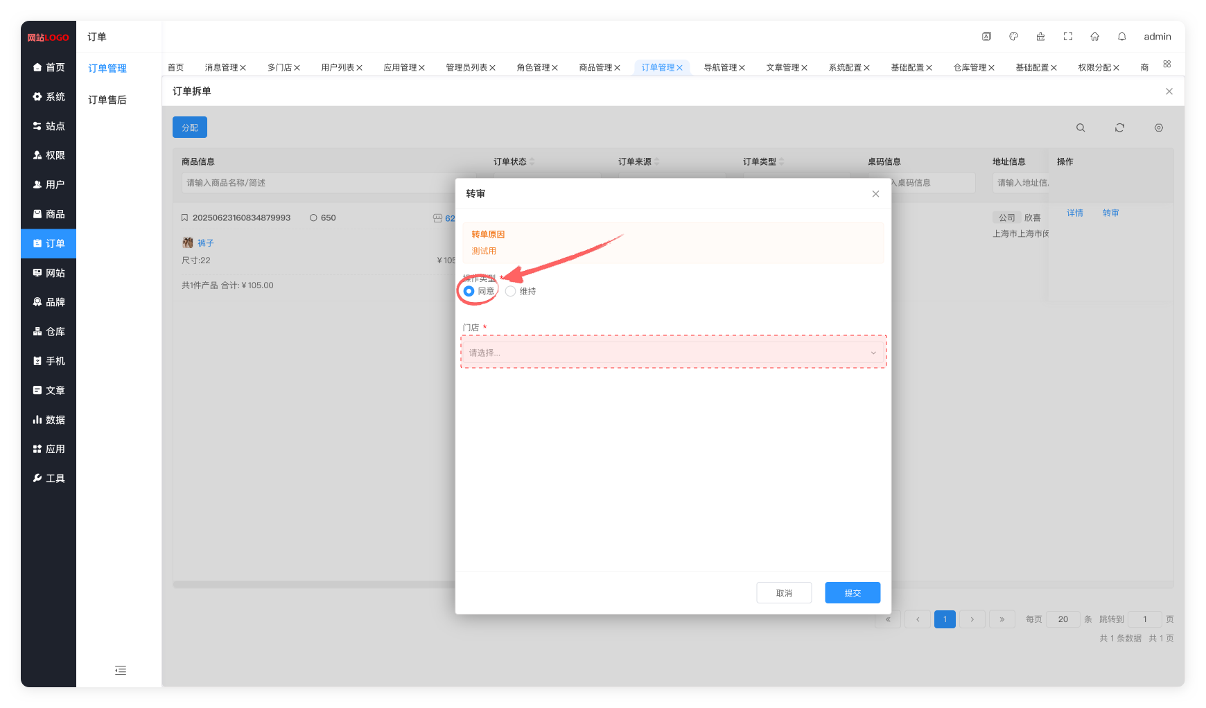 6.进入到订转审弹窗页面,点击操作类型,选择想要转单的门店,点击提交,完成转单审核。