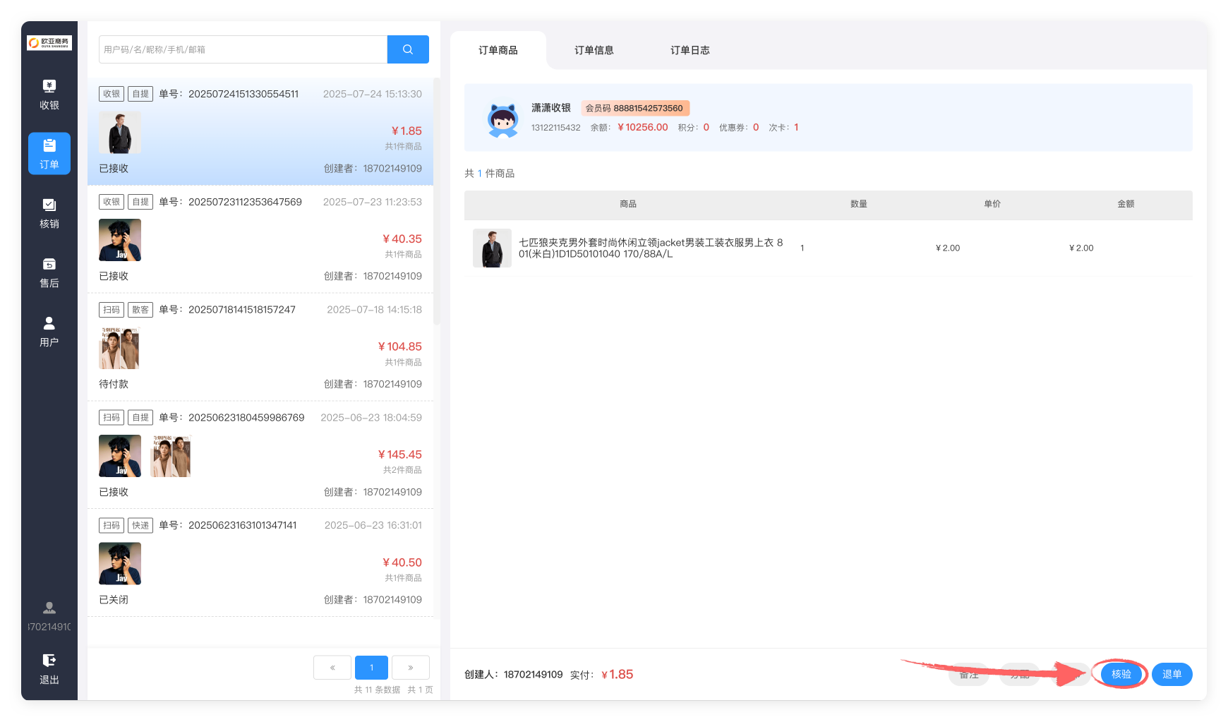 1.进入收银台,进入订单模块,在自提状态下点击右下核验按钮。