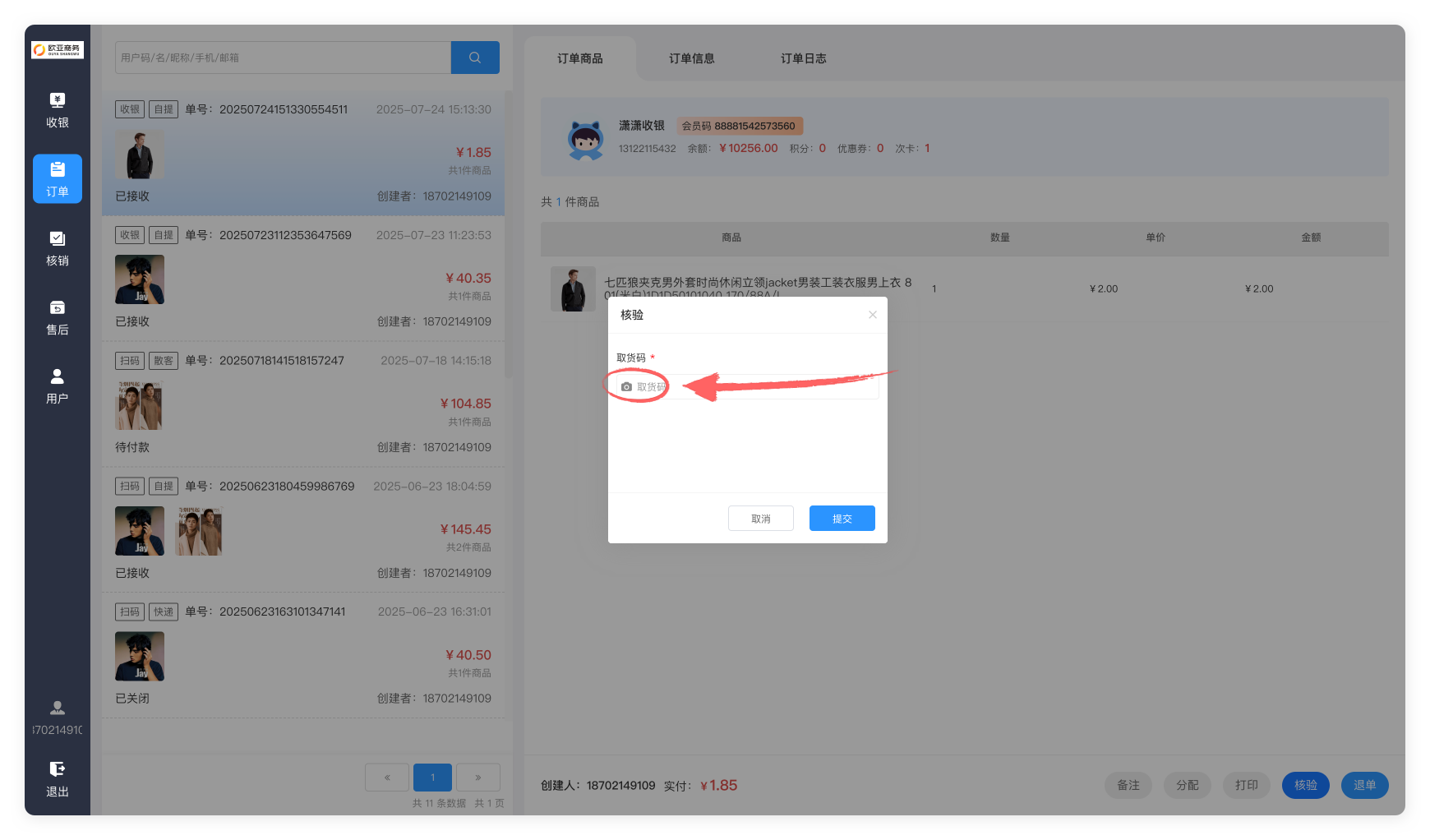 2.进入核验弹窗页,输入取货码,完成核验流程。