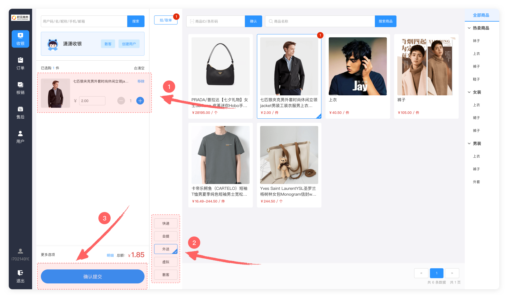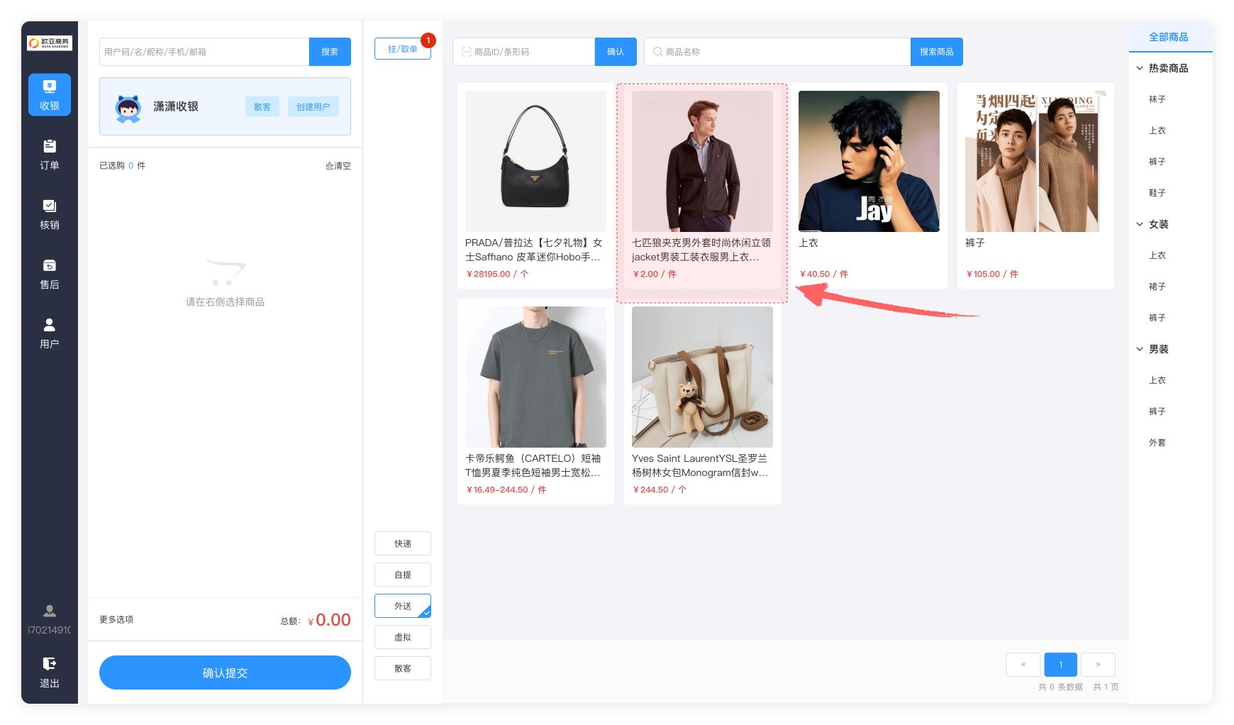 1.进入收银台,通过使用扫码枪去扫描商品或选择页面中间区域的商品模块,完成添加商品操作。 门店商品管理 >>