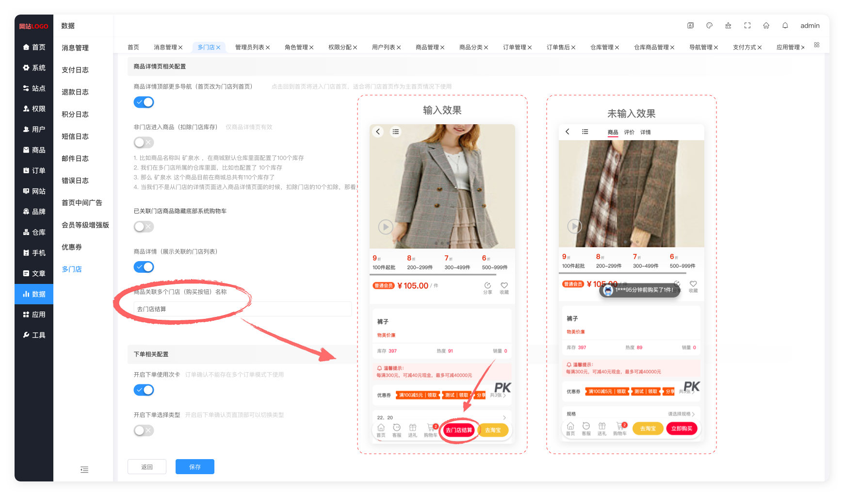 应用 → 应用管理  → 多门店 → 基础配置 → 开启/关闭商品关联多个门店(购买按钮)名称