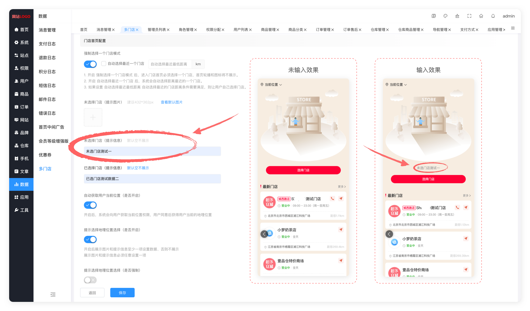 应用 → 应用管理  → 多门店 → 基础配置 → 未选择门店(提示信息)