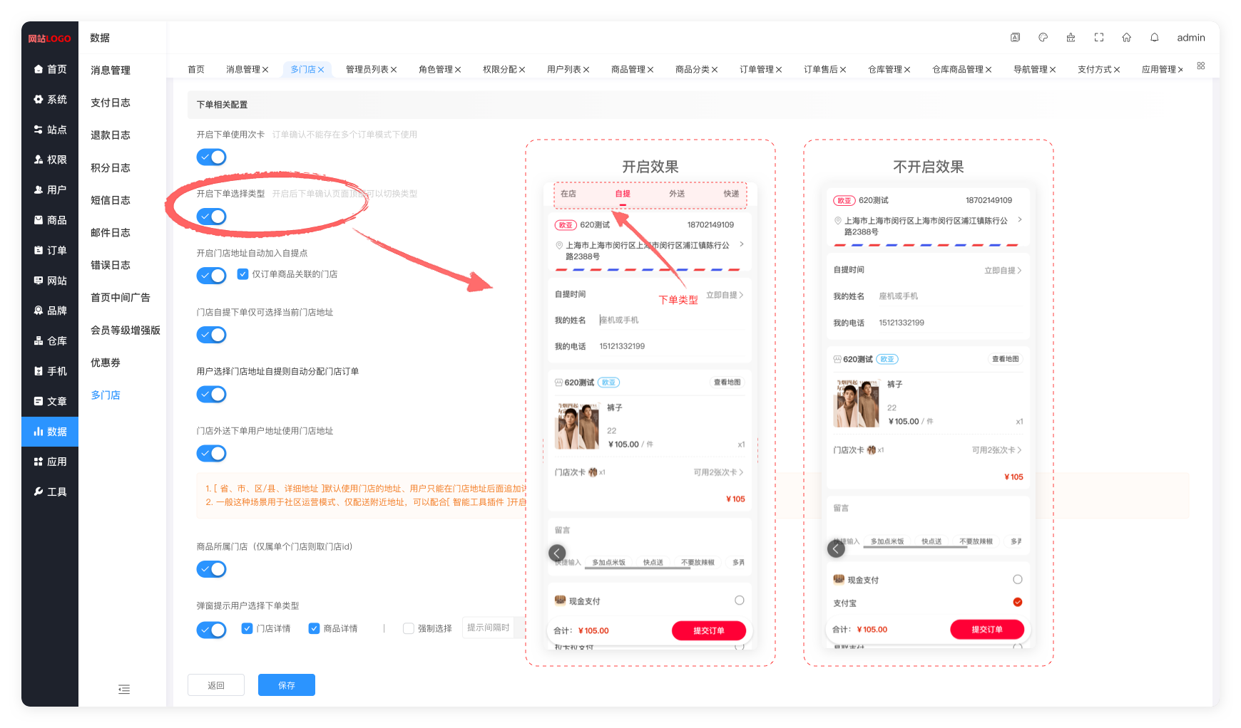 应用 → 应用管理  → 多门店 → 基础配置 → 开启/关闭下单选择类型