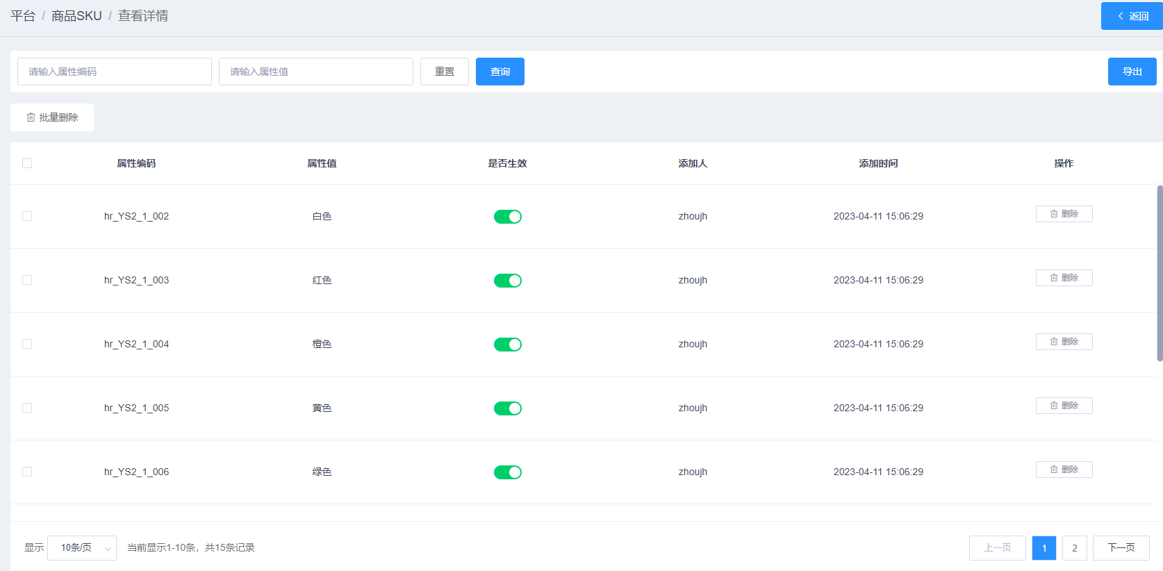 删除属性值:是否生效选择关闭,点击属性值右侧的【删除】,可删除属性值,也可批量删除属性值(注意:关闭是否生效时,只能关闭未使用的属性值)