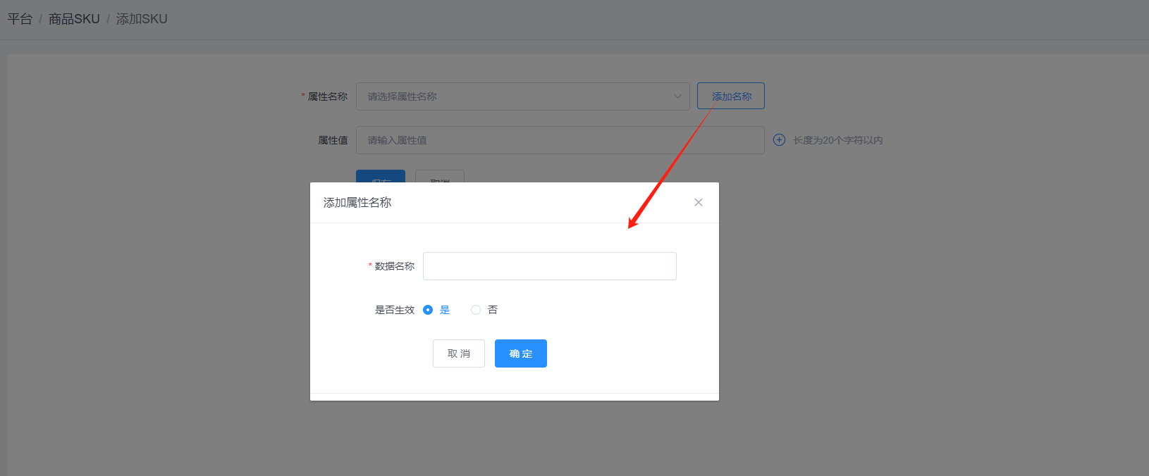 添加属性名称:若属性名称选项中无所需名称,则点击属性名称后面的【添加】按钮,可直接添加属性名称,如图所示: