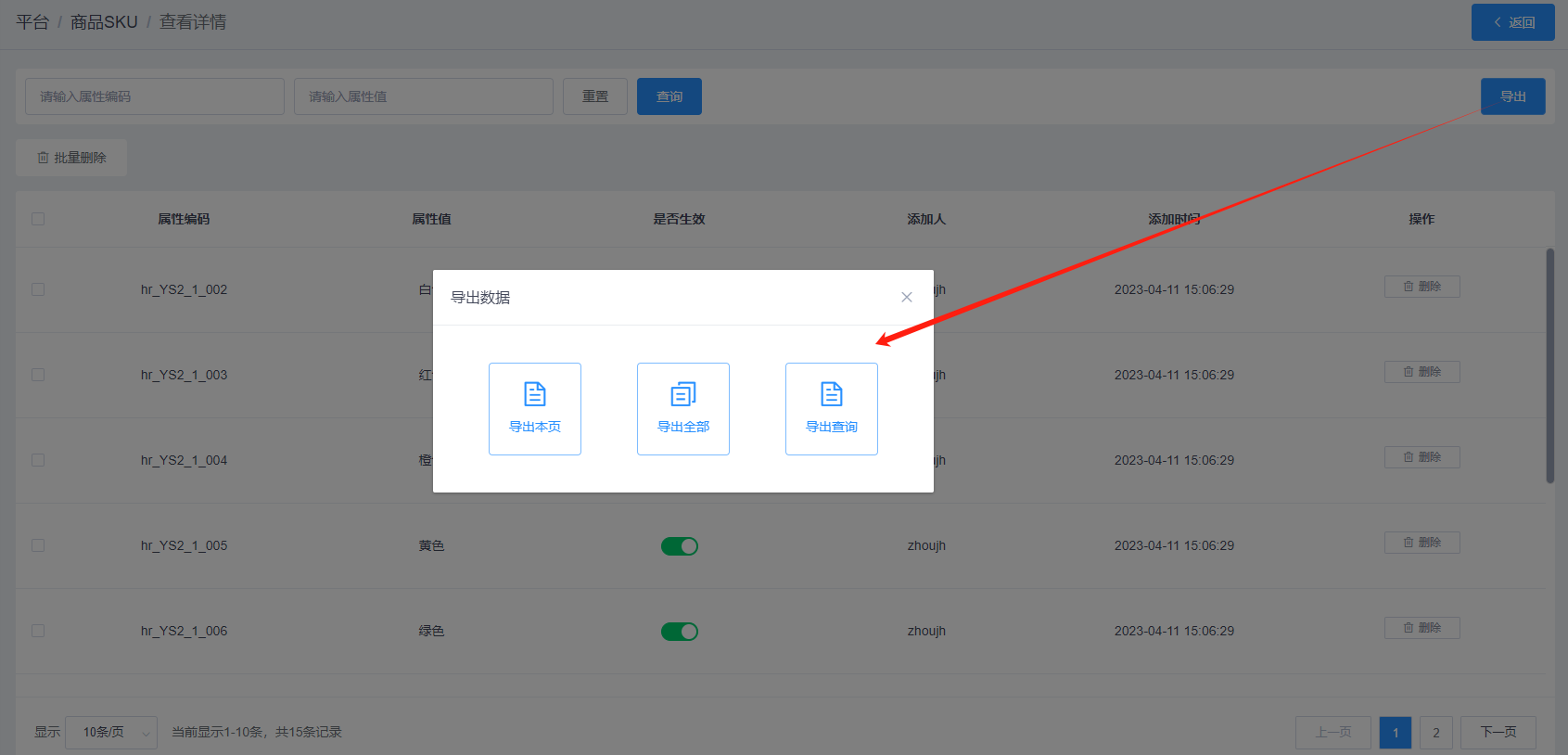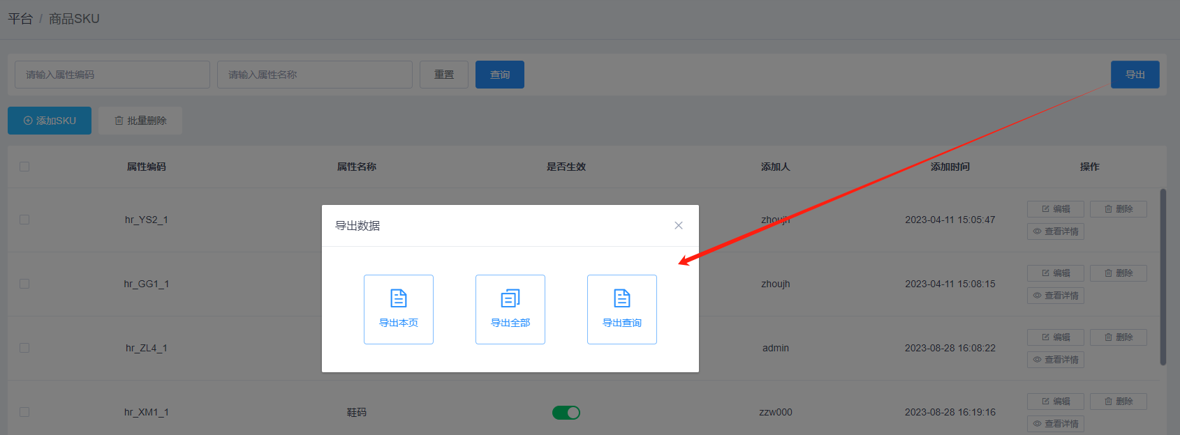 点击商品SKU页面的【导出】按钮,可以实现属性名称导出功能。通过选择导出的方式,可导出不同数据。具体如下: