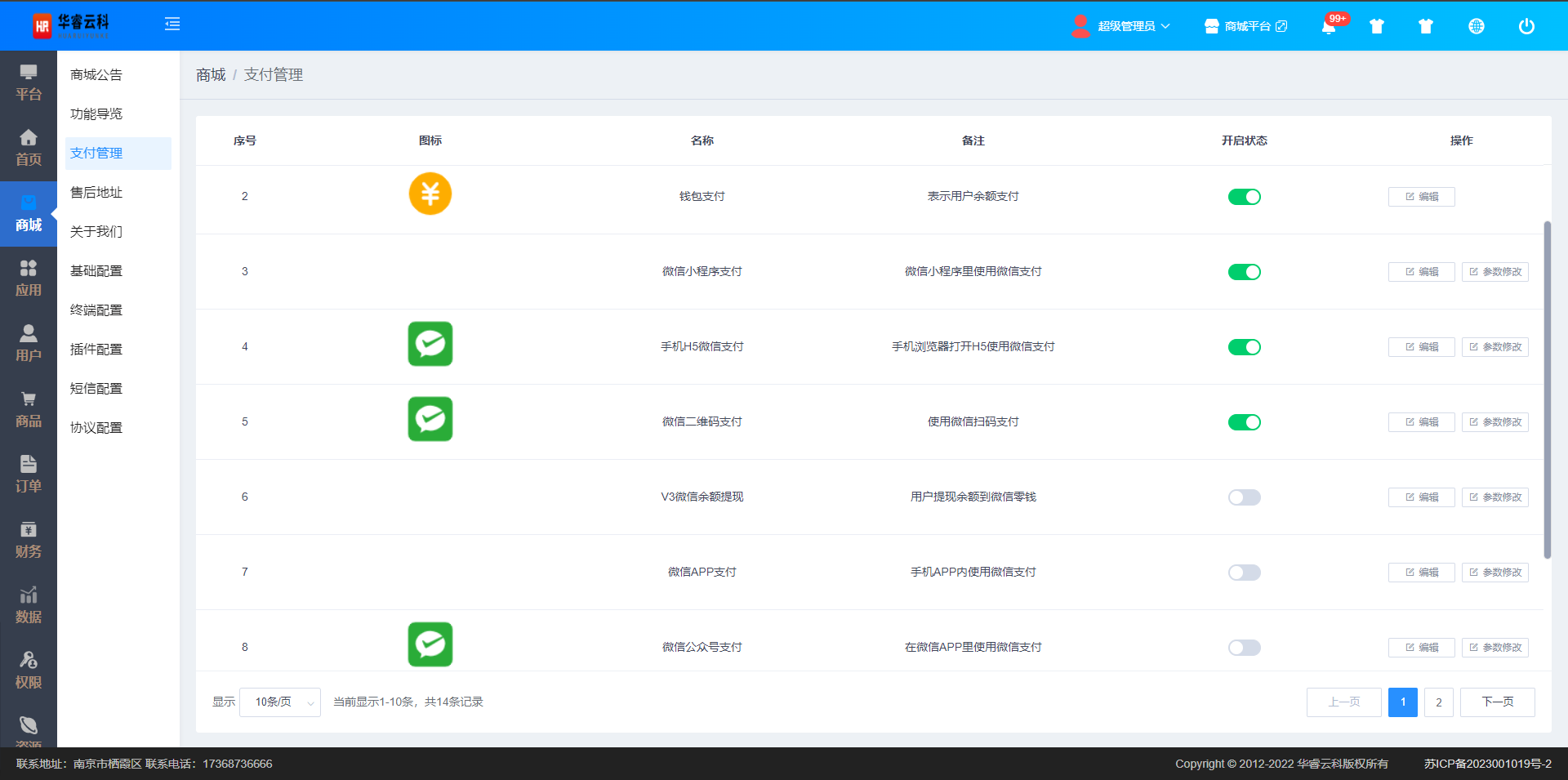 目录 搜索 展开 商城前期准备资料第一章 平台后台管理中心首页平台系统设置权限管理商城列表图片设置商品SKU公告管理数值管理报表管理物流管理商城商城公告功能导览支付管理售后地址关于我们基础配置终端配置插件配置卡券插件店铺插件预售插件积分商城插件秒杀插件分销插件会员插件拼团插件短信配置协议配置应用商城装修DIY模版店铺店铺列表店铺审核商品审核提现审核提现记录供应商供应商管理商品库待审核商品供应商订单经营收益提现审核提现记录提现设置卡券会员会员列表秒杀秒杀标签秒杀记录秒杀订单分销分销等级分销商管理分销商品佣金记录提现记录推荐关系商品预售商品列表预定记录销售记录预售订单积分商城积分商品兑换订单拼团拼团活动开团记录参团记录拼团订单资源商品商品分类分类审核商品品牌品牌审核运费管理商品列表商品排序显示下架商品商品删除商品导出商品标签库存管理库存预警入货详情出货详情订单订单列表实物订单代客下单打印订单自提订单退款售后订单设置评价管理订单结算用户用户列表添加用户余额充值积分充值代客下单用户设置提现管理提现审核提现记录提现设置 财务数据用户报表订单报表商品报表权限角色管理管理员列表管理员日志基本信息设置修改管理员密码第二章 商家后台管理中心商家登录验证码登录找回密码退出登录设置店铺信息轮播图设置修改密码店铺打烊店铺注销门店门店列表添加门店编辑门店信息删除门店门店查询权限角色管理添加角色查看角色编辑角色删除角色菜单列表添加菜单管理员列表添加管理员删除管理员管理员日志查询日志删除日志导出日志商品商品列表发布商品商品查询编辑商品信息商品上架商品下架增加库存商品删除商品导出查看商品待审核商品商品查询提交审核审核失败撤销审核编辑商品删除商品代售商品添加代售商品代售商品查询代售商品编辑代售商品删除订单全部订单订单查询订单编辑订单详情订单发货查看物流删除订单订单导出退款售后仅退款审核退货退款审核换货审核查看退货详情订单结算查看详情删除记录导出记录资金入账记录记录查询记录导出出账记录记录查询记录导出提现明细提现明细查询提现明细导出申请提现银行卡添加银行卡查询银行卡编辑银行卡信息设置默认银行卡 删除银行卡售后明细应用积分商城商品查询添加商品商品编辑商品删除商品排序兑换订单秒杀秒杀标签删除秒杀标签编辑秒杀标签秒杀商品查看秒杀详情秒杀记录秒杀订单订单删除编辑订单订单发货查看物流供应商供应商商品供应商订单退款售后订单结算第三章 移动端操作手册注册登录用户注册授权手机号码用户登录会员续费会员开通会员订单管理用户下单订单提醒订单删除订单查询自提订单再次购买订单取消订单详情查看物流确认收货商品评价申请售后撤销售后申请用户回寄商品个人中心用户个人资料设置银行卡管理用户积分用户消息用户钱包余额充值余额提现购物车申请开店我的店铺营销工具优惠券店铺设置运费模板门店管理发布商品发布实物商品发布虚拟商品设置属性商品管理待审核商品商品列表经营数据粉丝订单管理订单查询订单编辑订单关闭订单发货查看物流订单详情自提订单虚拟订单退款退货退款换货退货详情银行卡管理资金管理余额提现交易明细订单结算收银买单店铺打烊店铺注销秒杀限时秒杀立即抢购我的秒杀分销分销关系绑定申请成为分销商分销中心分销商推广我的团队佣金明细佣金提现提现明细推广订单分销规则商品分享分销商品分享插件商品分享店铺主页分享分销中心分享支付功能中心商品收藏取消商品收藏店铺关注取消店铺关注我的客服找回密码优惠券领取优惠券我的优惠券使用优惠券商品预售预售商品购买我的预售积分商城积分商品兑换我的兑换商品首页商品全部分类商品搜索商品详情第四章 供应商后台管理中心供应商后台登录系统退出修改供应商密码首页设置设置基础信息打印配置商品商品列表待审核商品违规下架商品发布商品运费管理关联店铺商品分类商品品牌订单订单列表订单结算退款售后库存库存列表库存预警入库详情出库详情账单提现记录银行卡管理出入账记录配置手册 小程序订阅消息配置阿里云短信服务配置阿里云OSS配置快递100配置支付配置手册后台支付配置支付方式说明配置参数详解支付宝手机支付所需参数操作步骤设置授权回调地址获取开发者私钥和支付宝公钥获取加密密钥获取APPID后台配置支付宝手机支付参数支付宝小程序支付所需参数 操作步骤获取APPID设置授权回调路径获取开发者私钥和支付宝公钥基础参数配置微信APP支付所需参数操作步骤获取AppId与AppSecret获取商户平台信息后台配置微信APP支付微信小程序支付所需参数操作步骤获取AppId与AppSecret设置授权回调路径获取商户平台信息 微信公众号支付所需参数操作步骤获取AppId与AppSecret设置授权回调路径获取商户平台信息公众号参数配置PC支付宝扫码支付所需参数常见问题商品分销供应商第五章 PC端操作手册首页展示我的购物车注册登录退出登录忘记密码我要开店商品列表商品详情立即购买退货/退款交易管理我的订单搜索售后管理搜索我的资产优惠券我的钱包钱包明细充值提现我