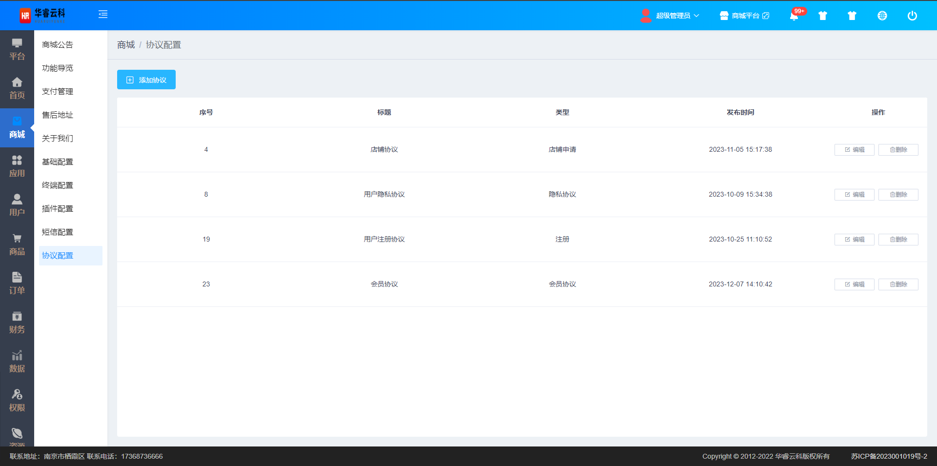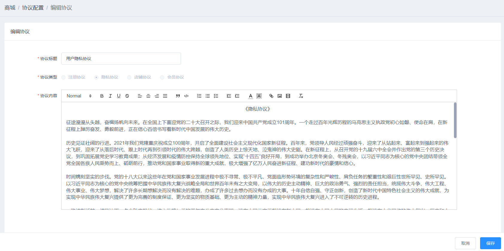 点击商城->协议配置,进入协议配置页面,如图所示: