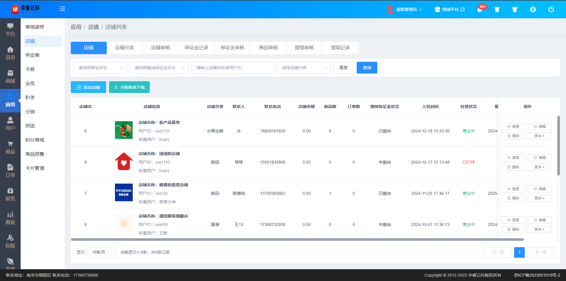 通过营业状态、缴纳保证金状态、店铺名称、用户ID、、店铺分类(可组合查询,可单一查询),点击【查询】按钮,可快速搜索到具体数据。