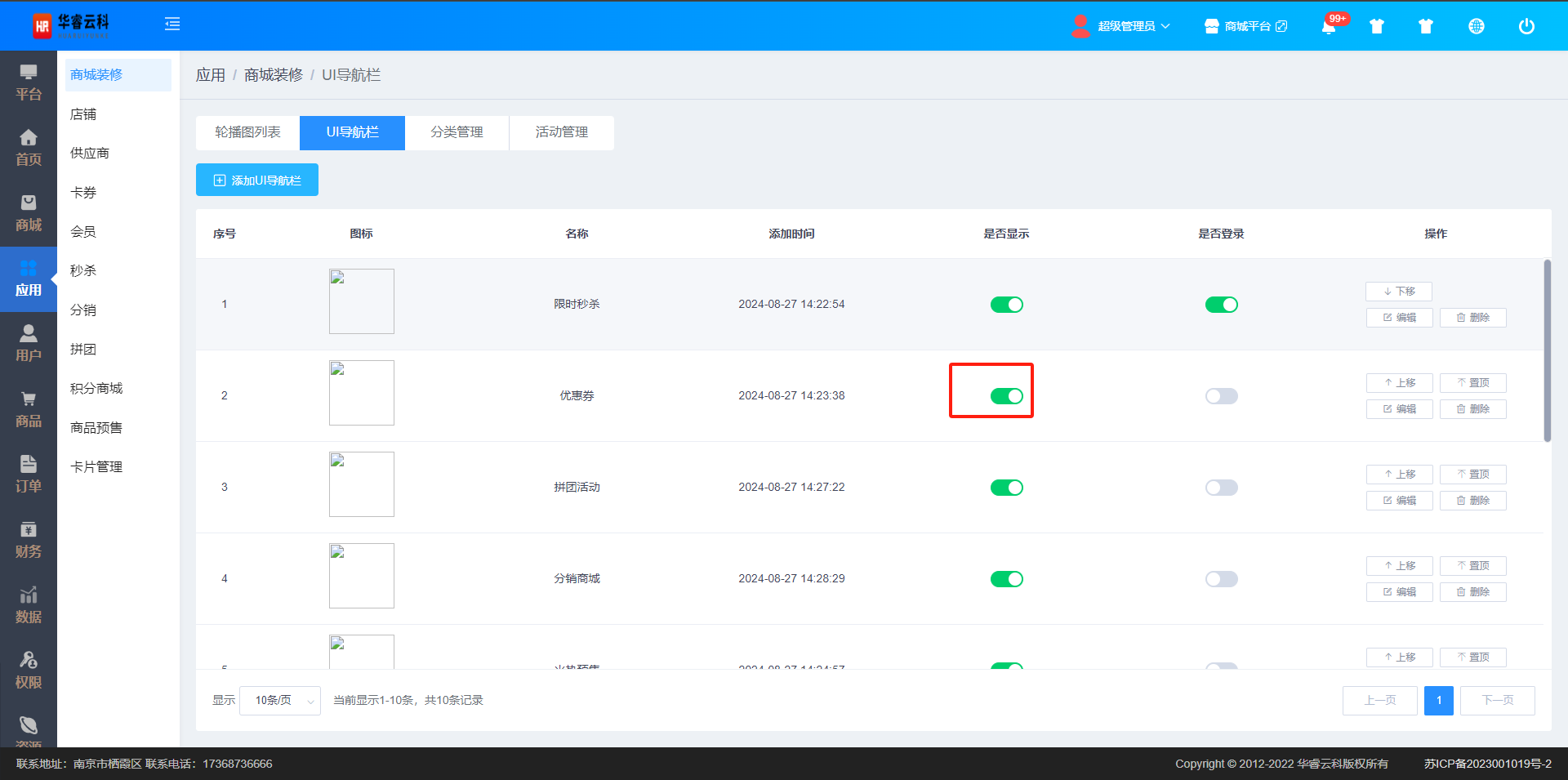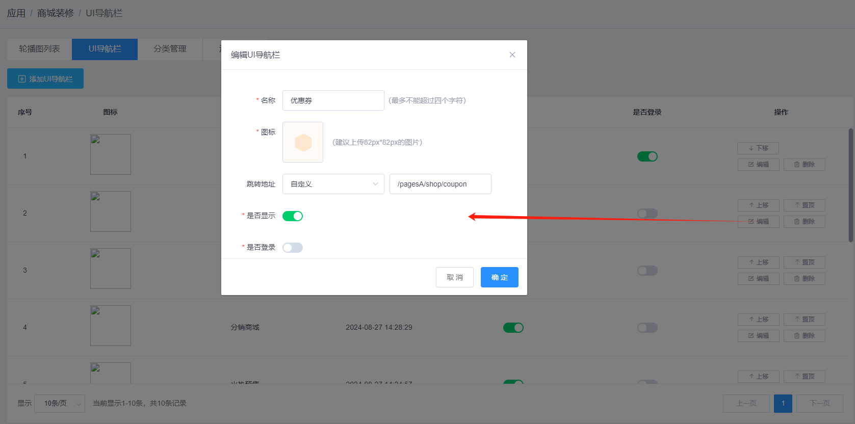 是否显示:打开时,呈现在系统首页、默认模板应用后的预览图界面;关闭时,导航栏不呈现。
