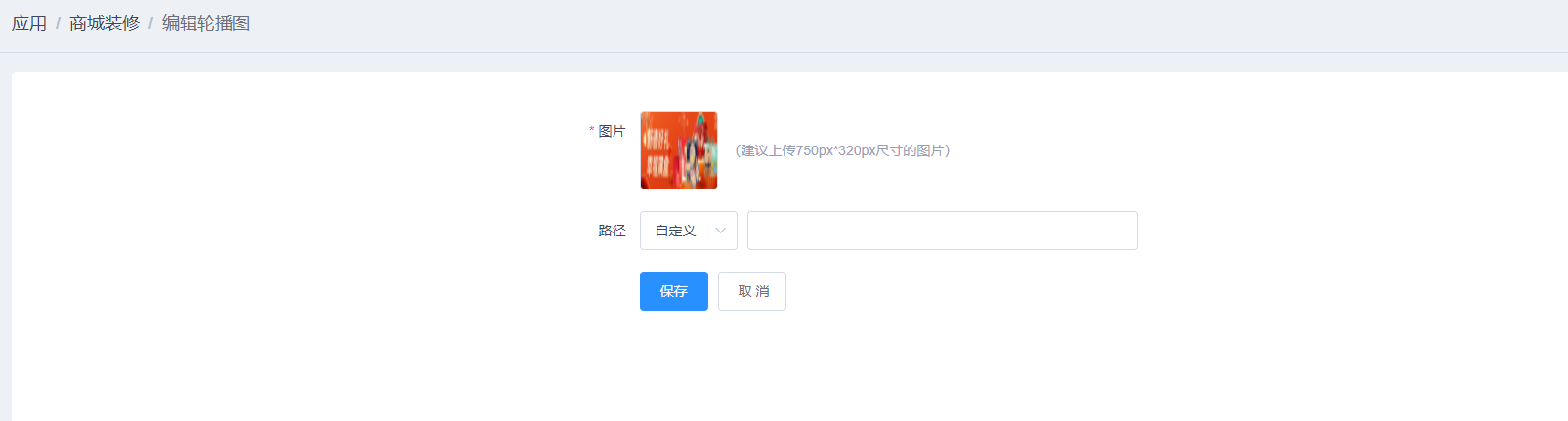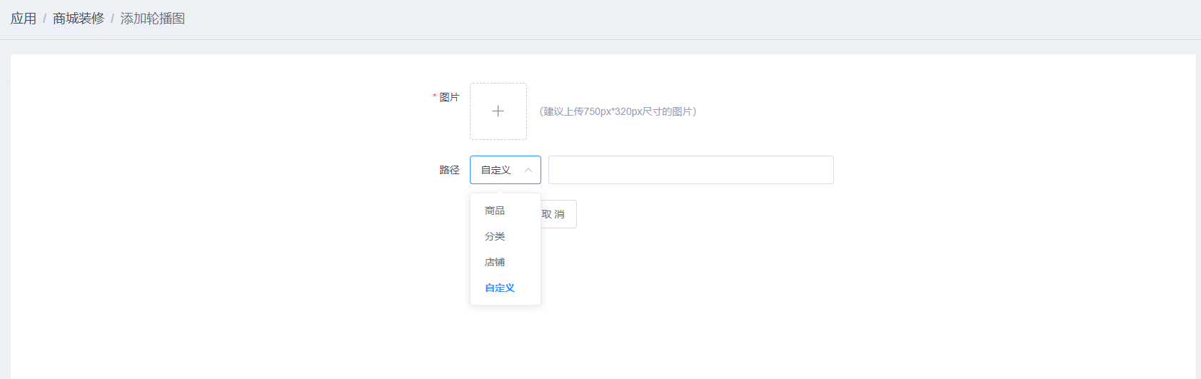 在默认模板->轮播图列表界面中,点击“添加轮播图”按钮,跳转轮播图添加界面,依次上传轮播图、选择调整路径(商品、分类、店铺、自定义)、选择对应的值,保存成功,轮播图列表新增数据(轮播图影响移动端首页图片呈现)。