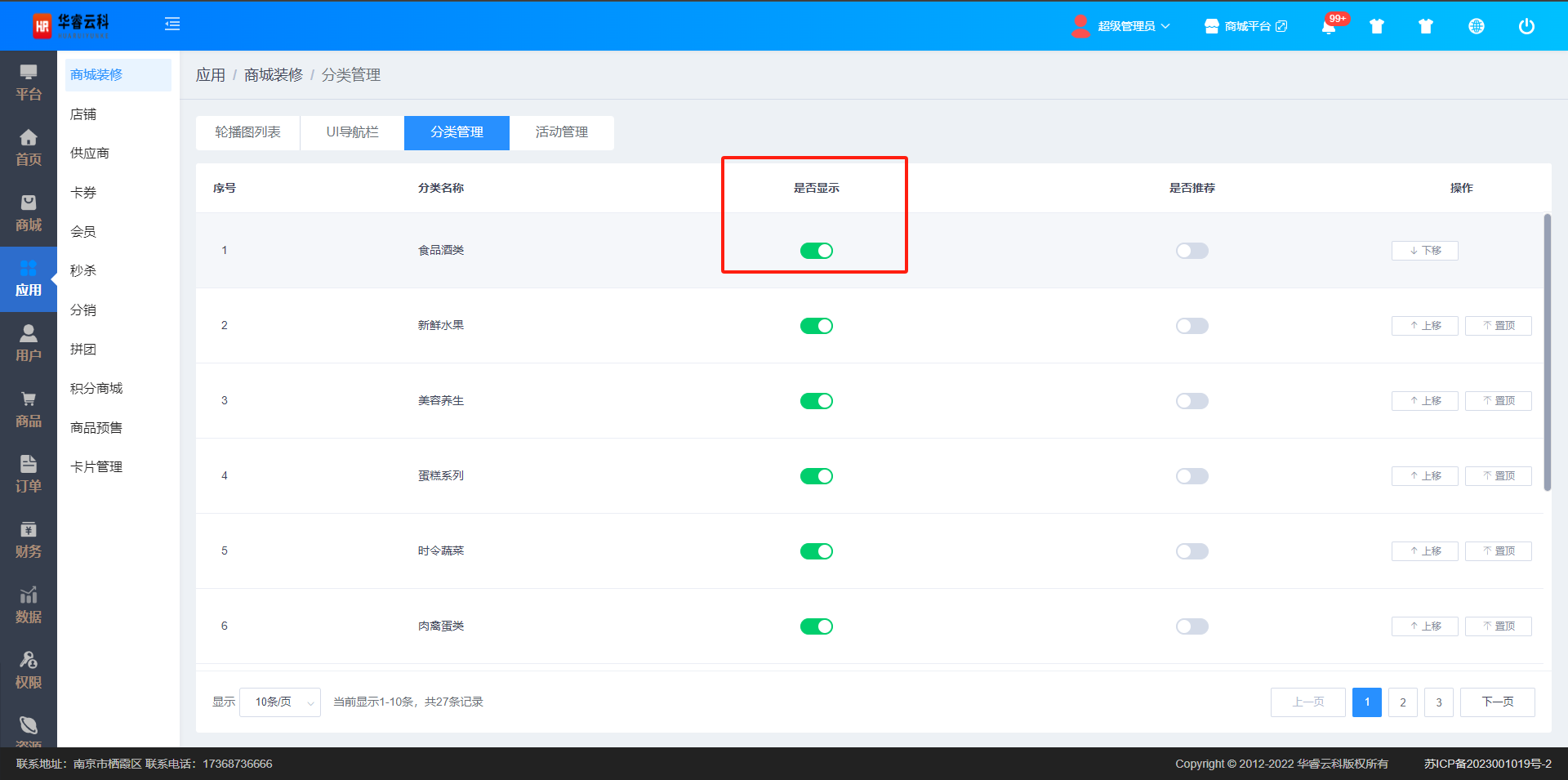 在默认模板->分类管理列表界面中,选择需要操作的一级分类;打开显示:移动首页呈现该一级分类与分类下所有商品;关闭显示:移动首页该一级分类与分类下所有商品都不呈现。