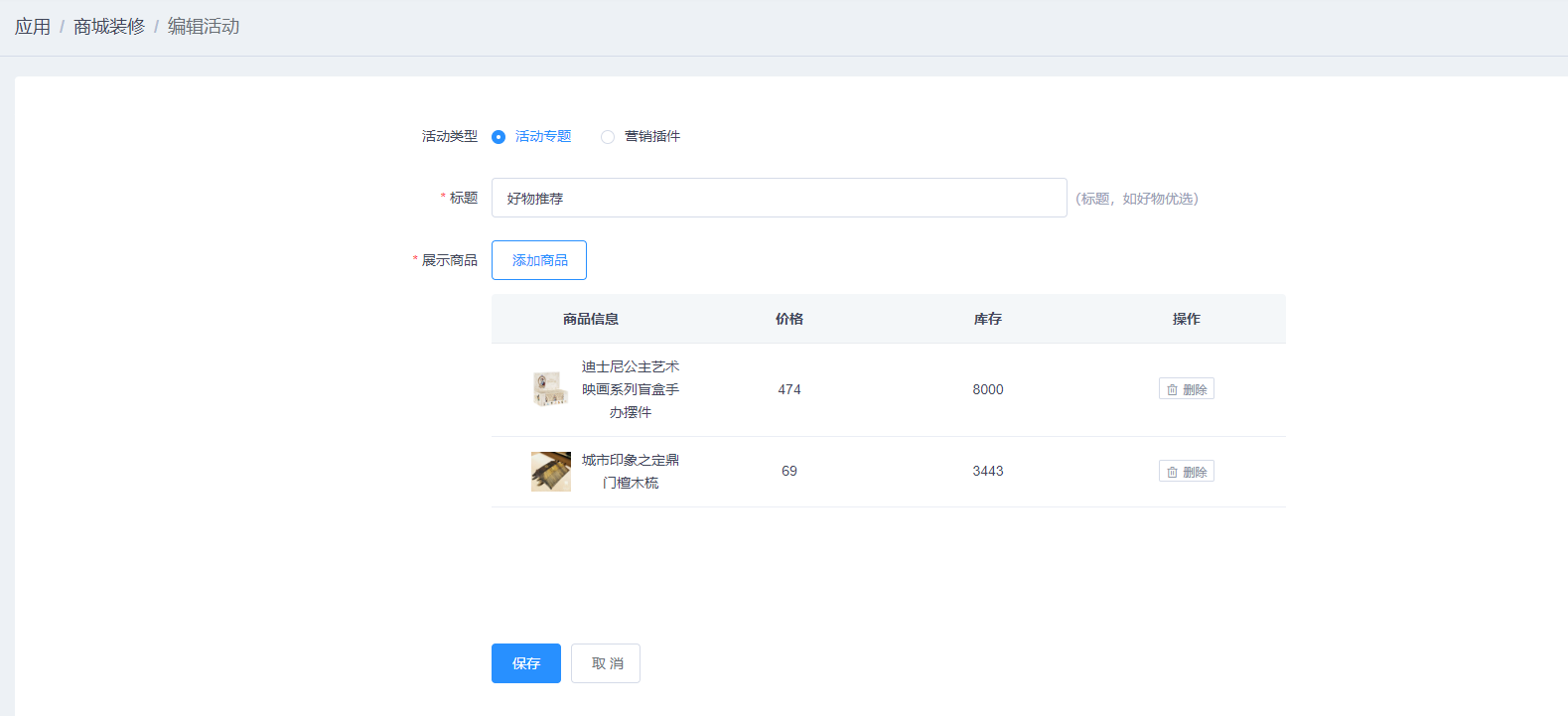 在默认模板->活动管理列表界面中,点击“添加活动”按钮,跳转至活动添加界面,选择活动类型:“活动专题”,输入活动名称、添加活动商品,保存成功,活动列表增加新的专题活动,新活动都默认展示在移动端首页。