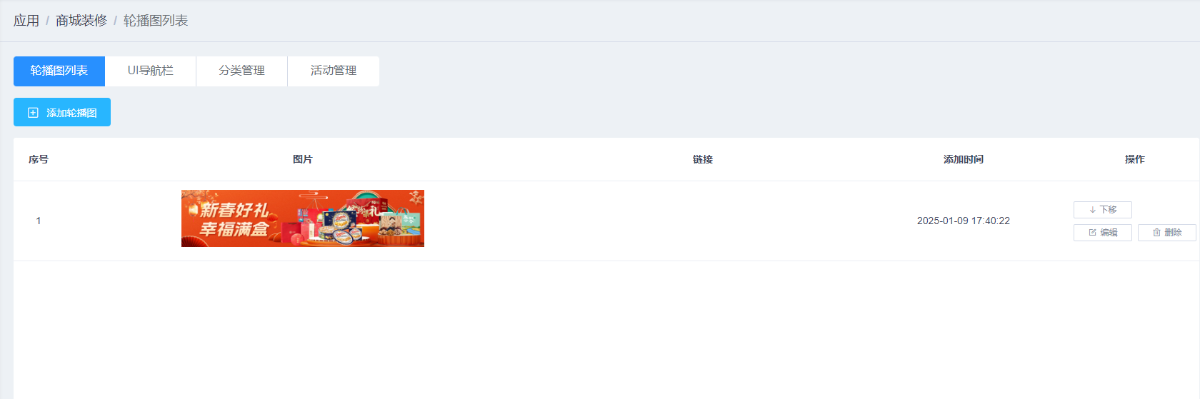 在默认模板->轮播图列表界面中,选择需要更改顺序的轮播图,点击右侧操作栏的“上移”/“下移”或“置顶”按钮,可设置轮播图播放顺序,移动端轮播图播放顺序与列表一致。