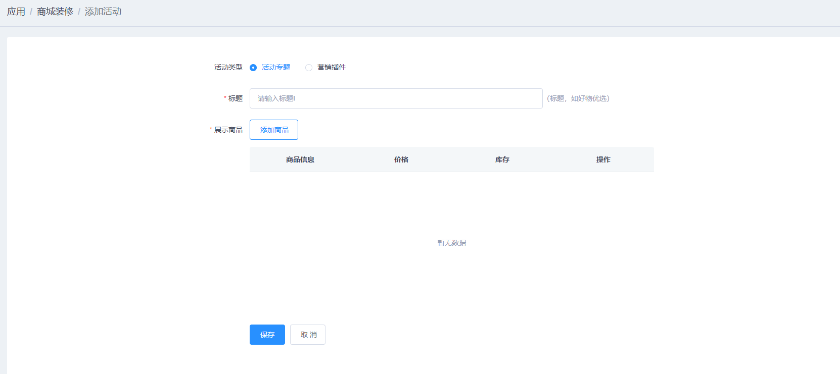 在默认模板->活动管理列表界面中,点击“添加活动”按钮,跳转至活动添加界面,选择活动类型:“营销插件”,选择插件类型、输入标题,保存成功,活动列表增加新的营销活动。
