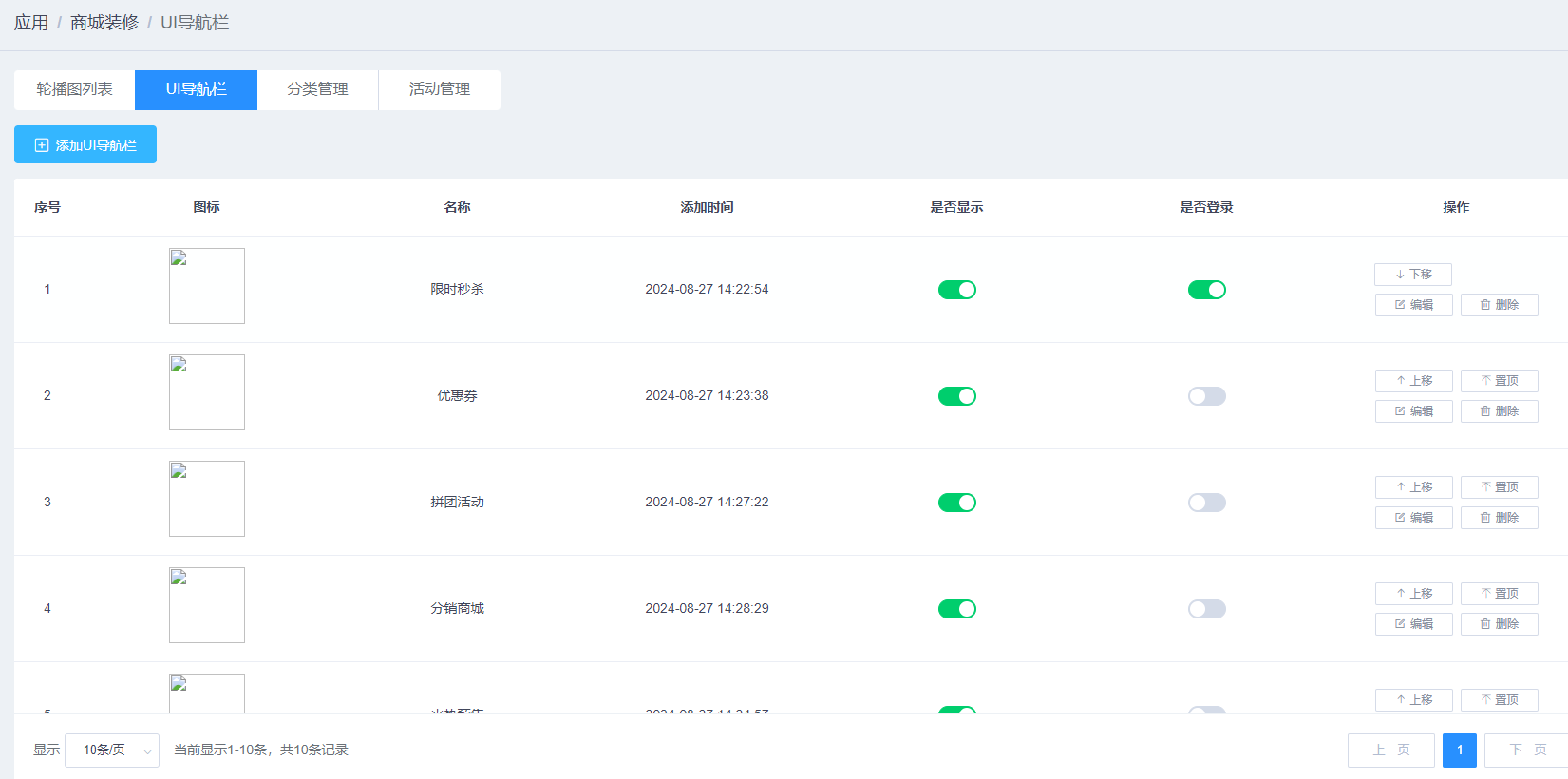 在默认模板->UI导航栏列表界面中,选择需要更改顺序的导航栏,点击右侧操作栏“上移”/“下移”或“置顶”按钮按钮,可更改UI导航栏呈现顺序(移动端首页导航栏呈现顺序与UI导航栏列表呈现顺序一致),