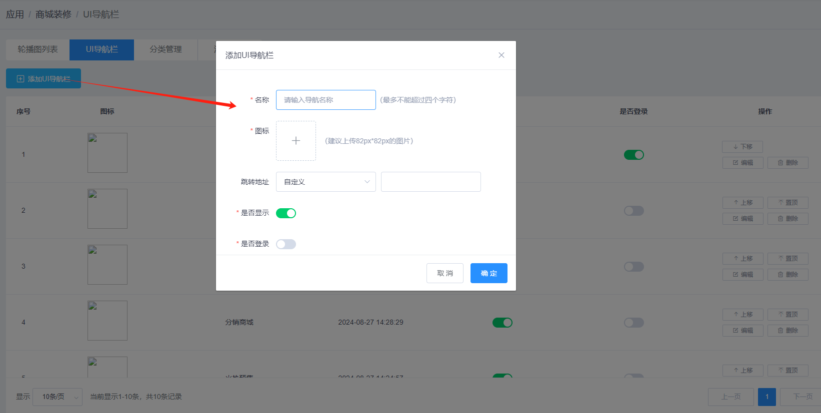 在默认模板->UI导航栏列表界面中,点击“添加UI导航栏”按钮,界面弹出UI导航栏添加页面,保存成功,导航栏列表新增数据。