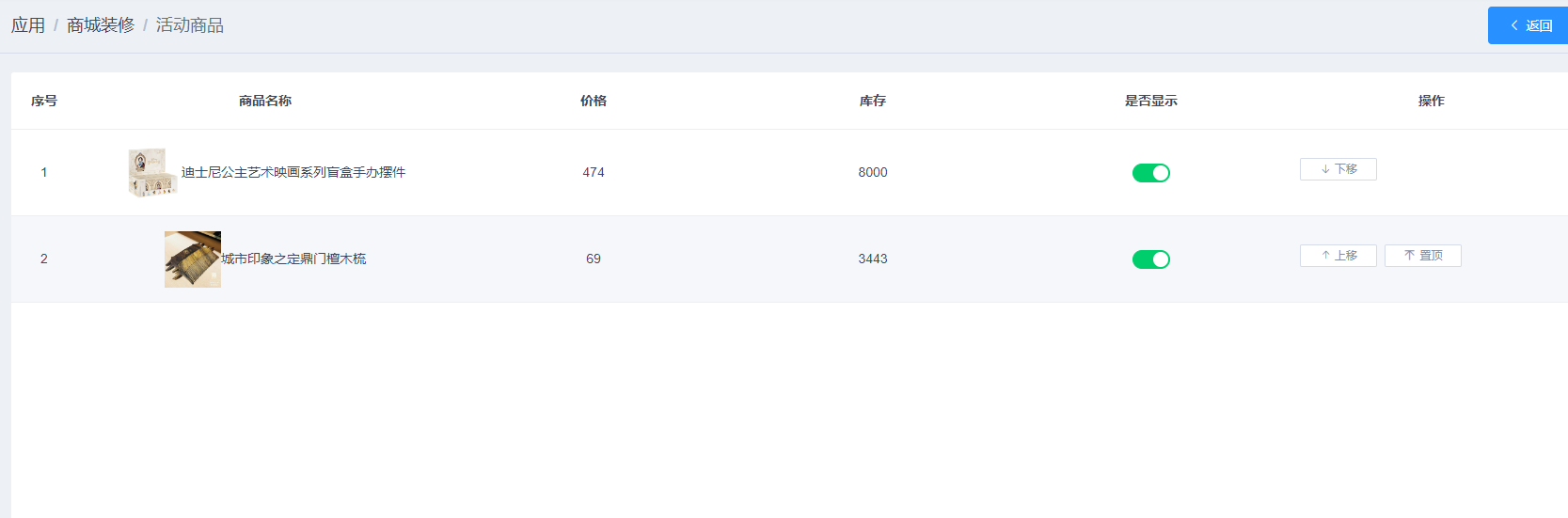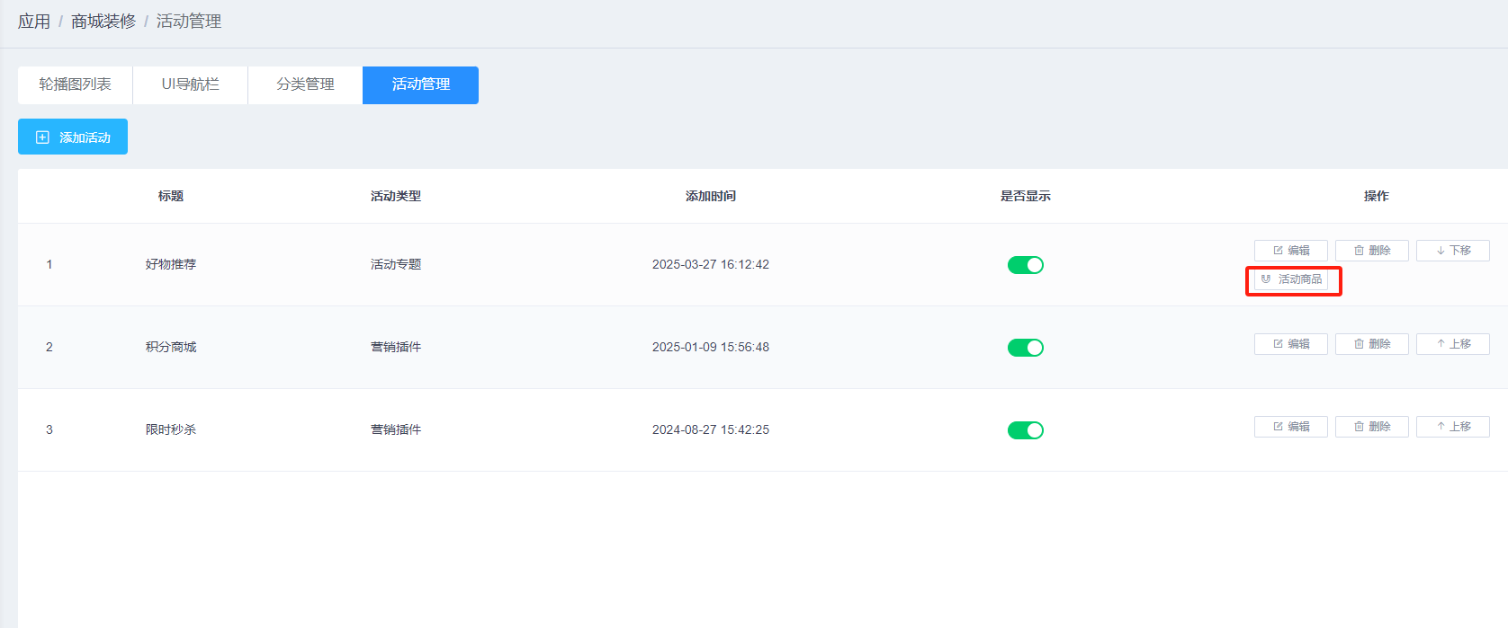 上移、下移、置顶:控制商品在该活动中的呈现顺序,呈现顺序与活动列表的商品呈现顺序一致。