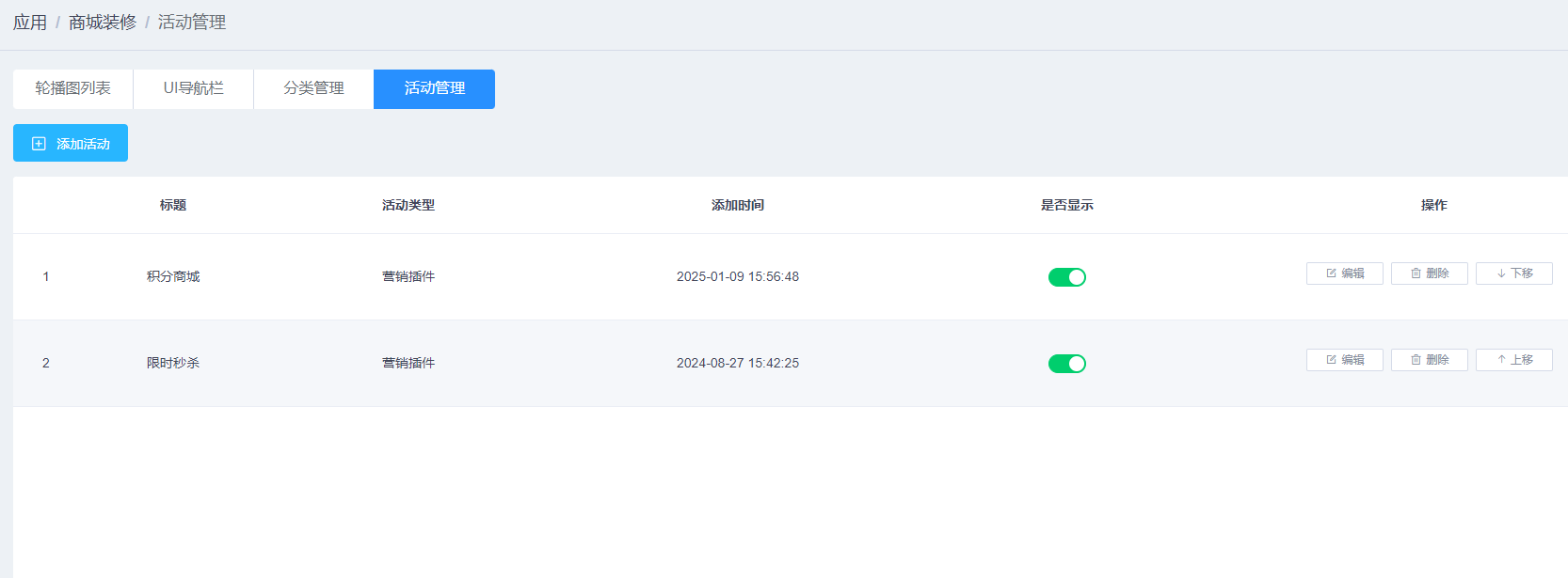 在默认模板->活动管理列表界面中,选择需要更改顺序的活动,点击右侧操作栏【上移】或【下移】按钮,可更改活动的呈现顺序(移动端首页活动呈现顺序与活动列表呈现顺序一致)。