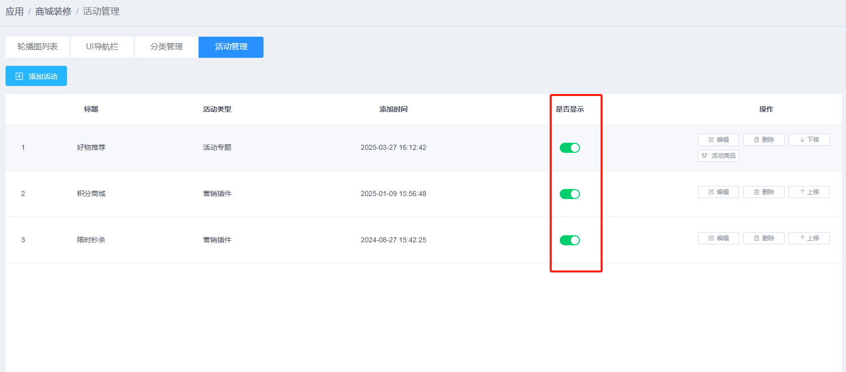 在默认模板->活动管理列表界面中,选择对应的活动,关闭或打开是否显示按钮,可控制该活动是否在移动端首页呈现。