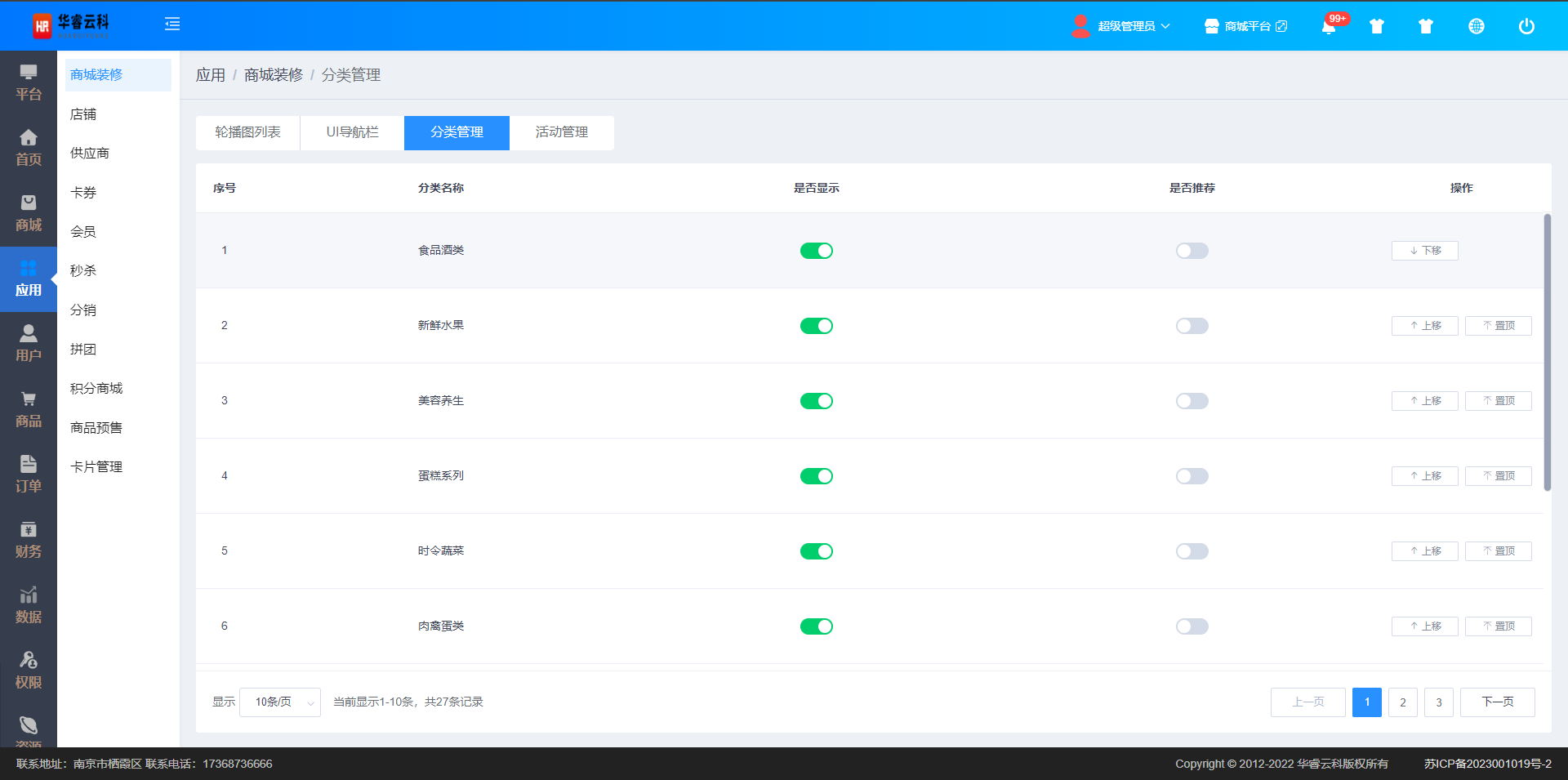 在默认模板->分类管理列表界面中,选择需要更改顺序的一级商品分类,点击右侧操作栏“上移”/“下移”或“置顶”按钮;可更改移动端首页商品分类呈现顺序(移动端首页商品分类呈现顺序与分类列表呈现顺序一致)。