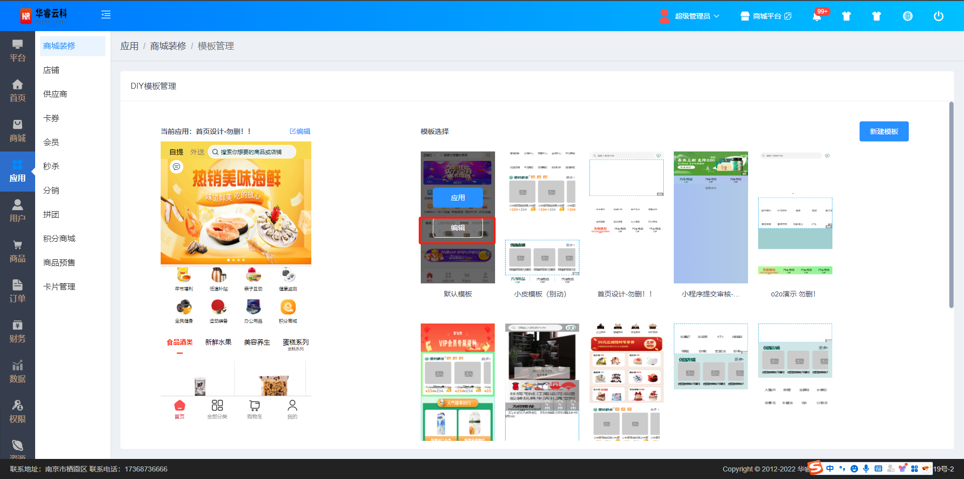 进入商城,点击应用->模板管理,选择默认模板,点击“编辑”按钮,界面跳转默认模板管理的相关界面。