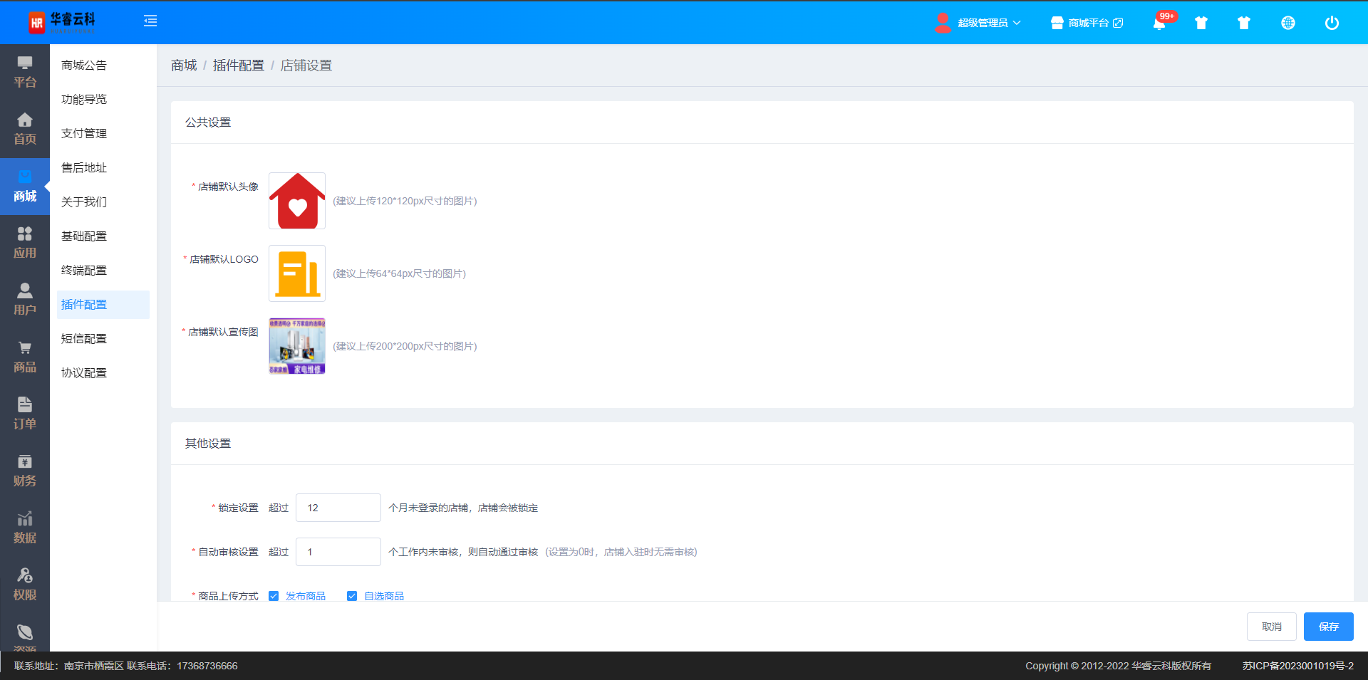设置店铺默认头像、默认LOGO、默认宣传图、锁定设置、自动审核设置、商品上传方式、保证金设置、提现设置,点击【保存】。