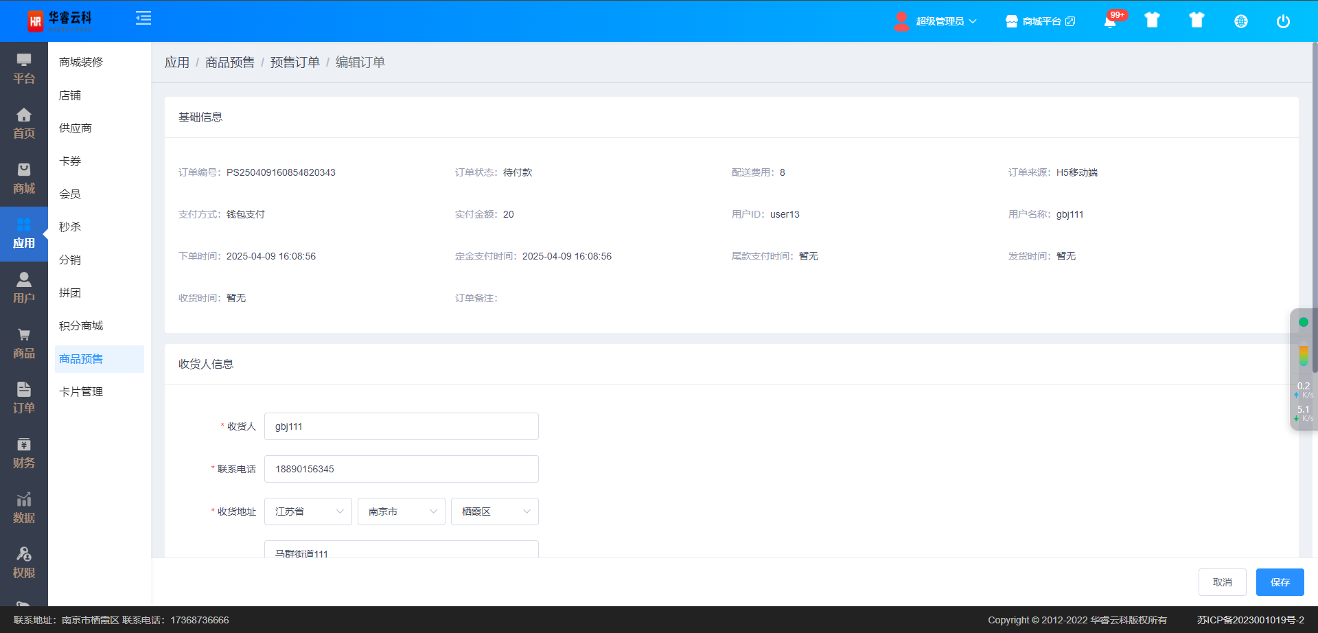 待付款订单可编辑:订单状态、收货地址、支付金额
