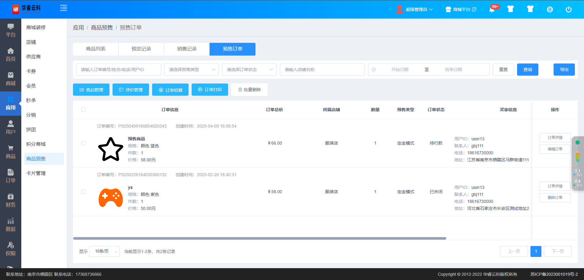 预定记录列表是所有预售商品生成订单的记录,包括待付款、订单关闭、待收货等等。