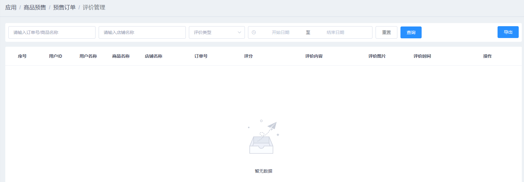 在预售订单页面,通过【评价管理】按钮,进入评价管理页面,如图所示: