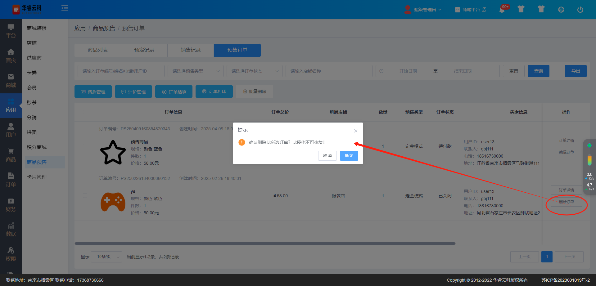 在预售订单列表展示界面,勾选需要删除的订单,点击【批量删除】按钮;可进行订单删除操作,平台删除订单后,移动端与平台订单都不呈现,如图所示: