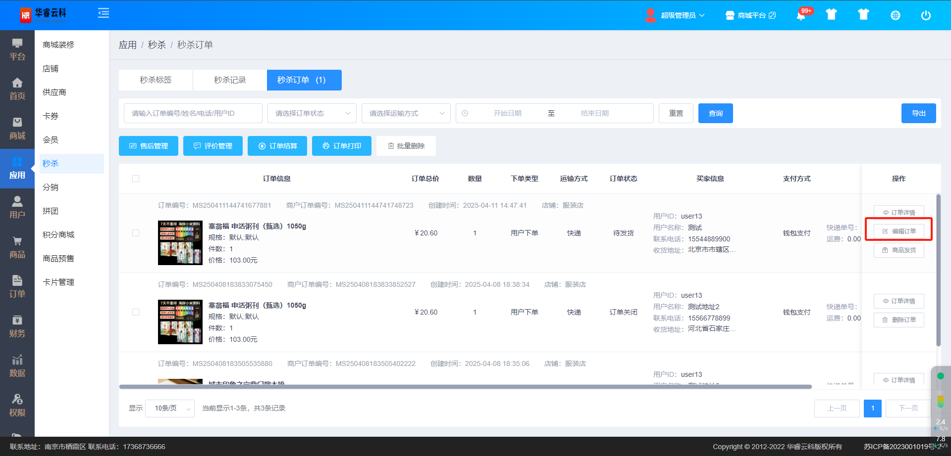 在秒杀订单列表展示界面,选择需要编辑的订单,点击右侧操作栏【编辑订单】按钮;可对订单进行编辑,如图所示: