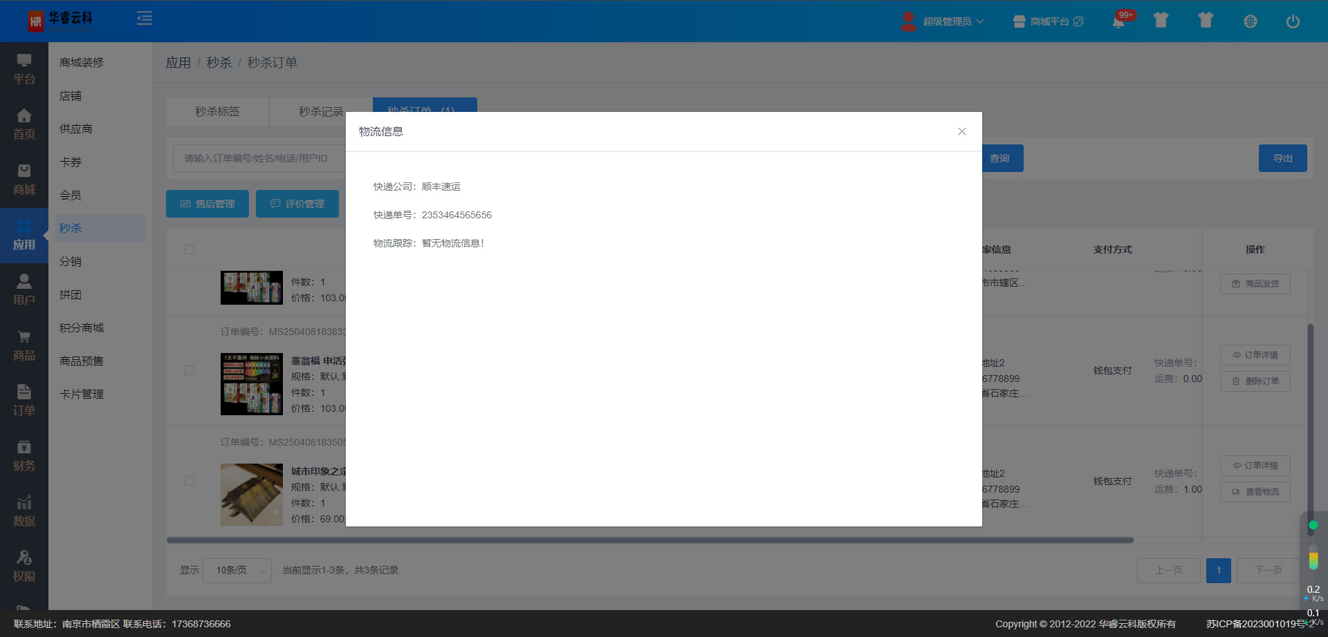 在秒杀订单列表展示界面,选择需要查看物流的订单,点击右侧操作栏【查看物流】按钮,可进行订单物流查看(需要对接快递100),如图所示: