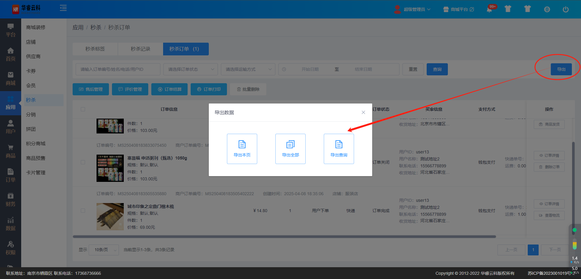 点击秒杀订单列表页的【导出】按钮,可以实现订单记录导出功能。通过选择导出的方式,可导出不同数据。具体如下:
