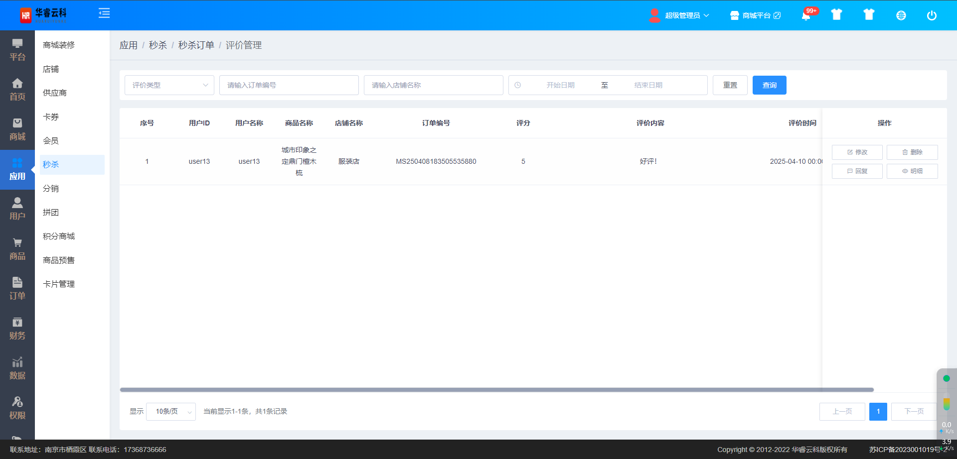 在秒杀订单页面,通过【评价管理】按钮,进入评价管理页面,如图所示: