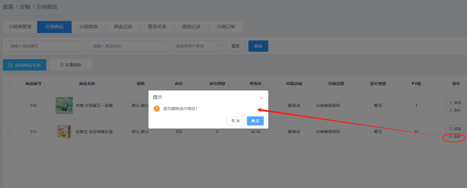 “分销商品”标签页面,选择需要删除的商品,点击右侧操作栏“删除”按钮,可对商品进行删除操作。