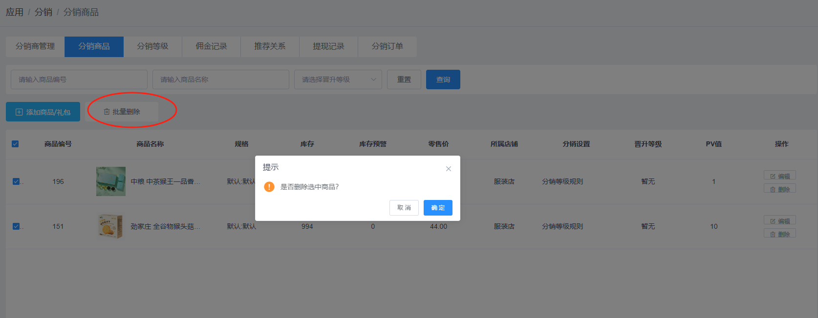 “分销商品”标签页面,选择需要删除的商品,点击“批量删除”按钮,可对商品进行批量删除操作。