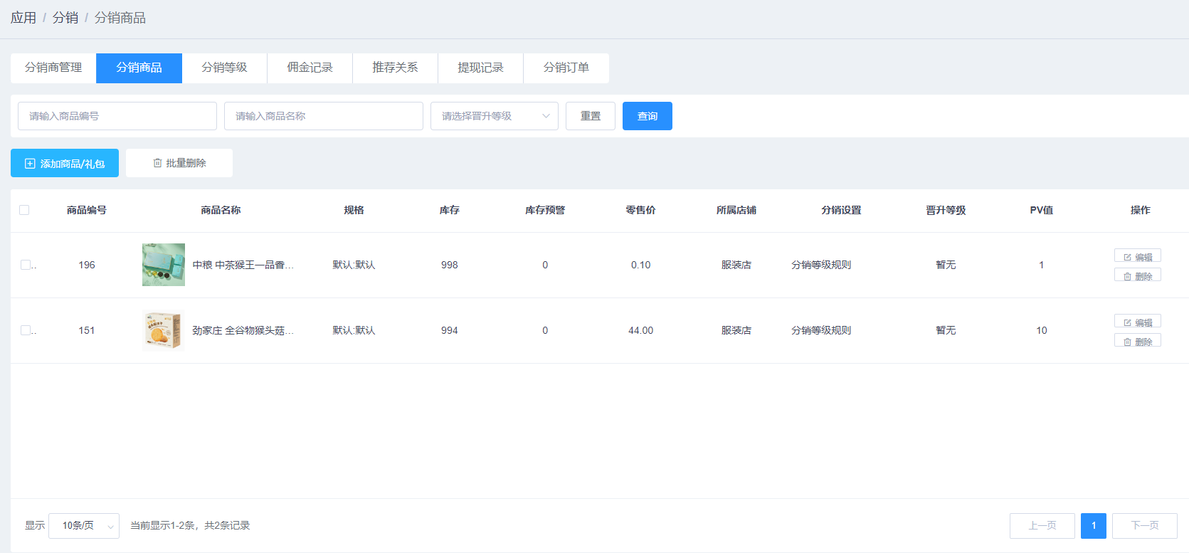 “分销商品”标签页面,可根据商品编号、商品名称、等级快速查询分销商商品记录,数据超出10条,则分页展示,如图所示: