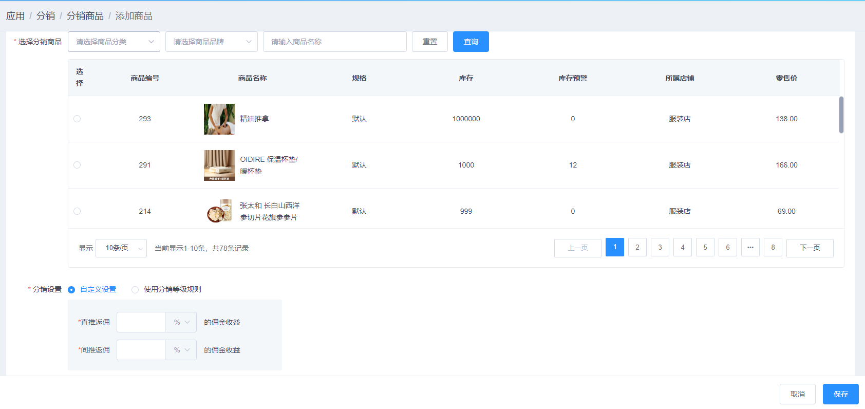 自定义直推与间推分佣,指用户购买此商品时按照配置的分佣比例分佣。