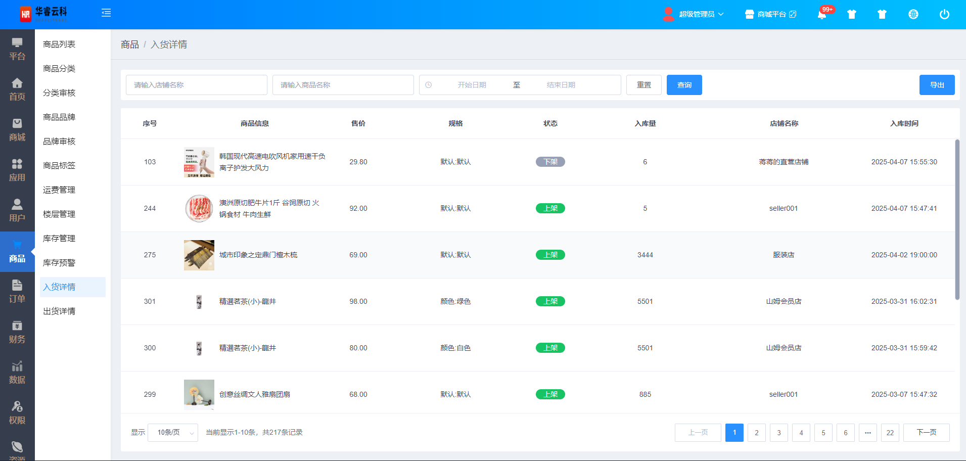 在入货详情页面,输入店铺名称、商品名称、入库时段,点击【查询】按钮,可查询到具体入货详情记录,如图所示: