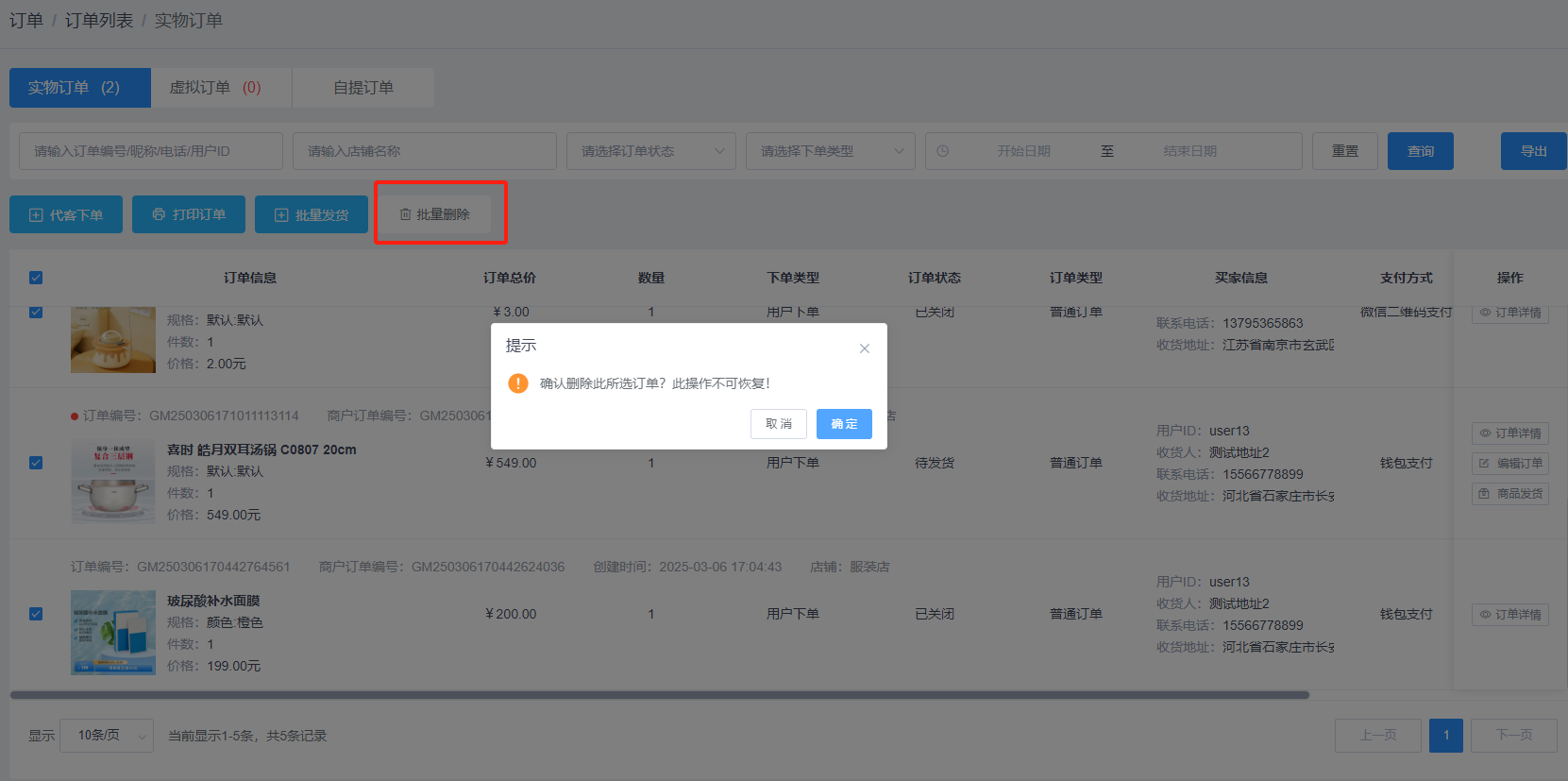 在订单列表展示界面,勾选需要删除的订单,点击【批量删除】按钮;可进行订单删除操作,平台删除订单后,移动端与平台测订单都不呈现,如图所示: