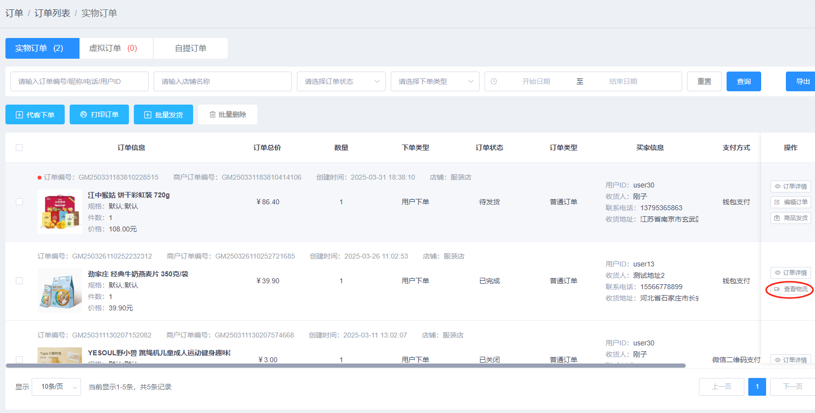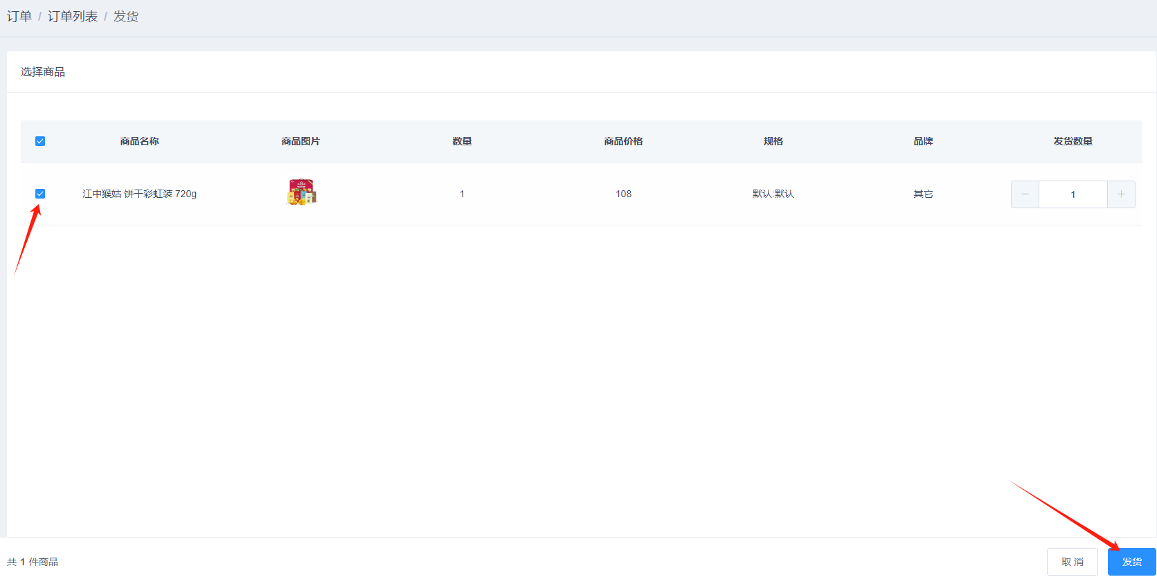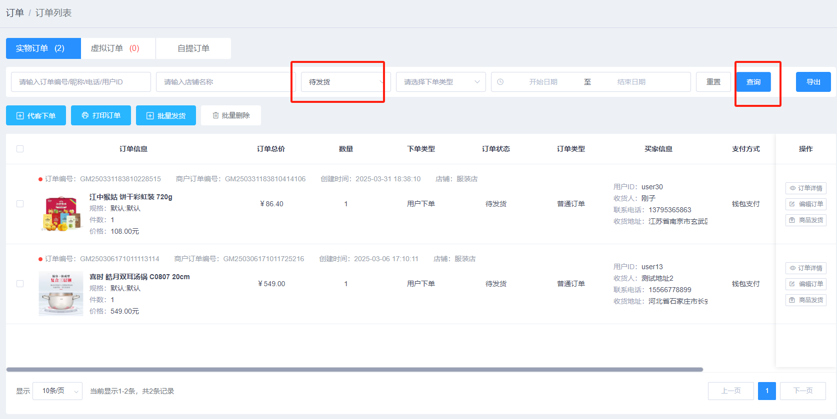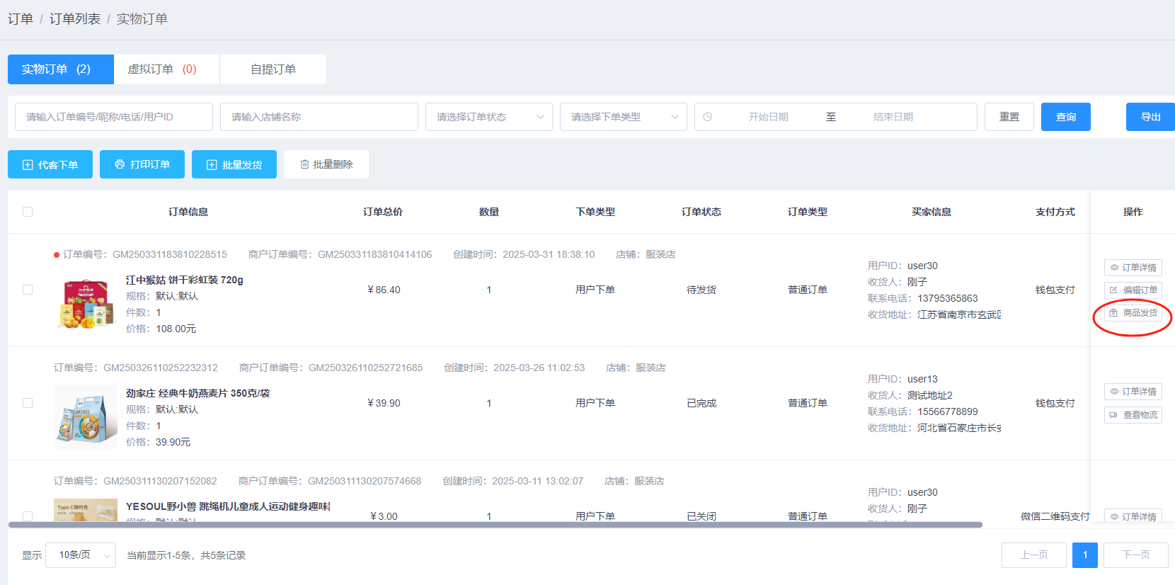 在订单列表展示界面,选择需要发货的‘待发货’订单,点击右侧操作栏【商品发货】按钮,可进行商品发货,如图所示: