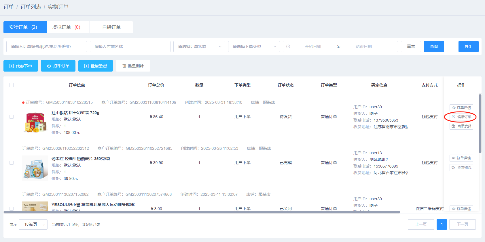 - 待付款订单可编辑:订单状态、收货地址、支付金额
