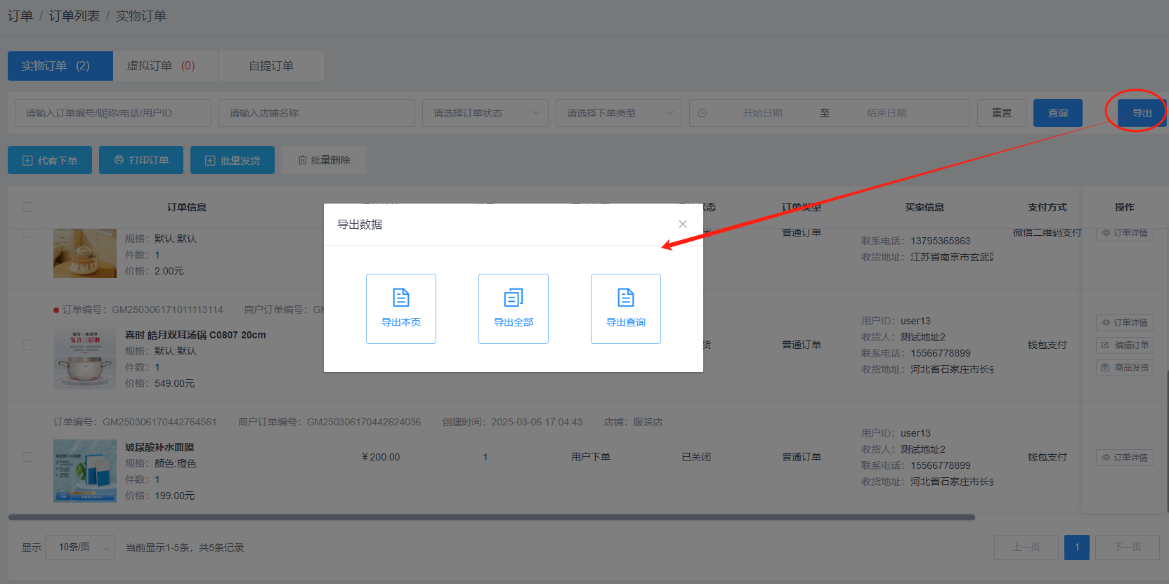 点击订单列表页的【导出】按钮,可以实现订单记录导出功能。通过选择导出的方式,可导出不同数据。具体如下: